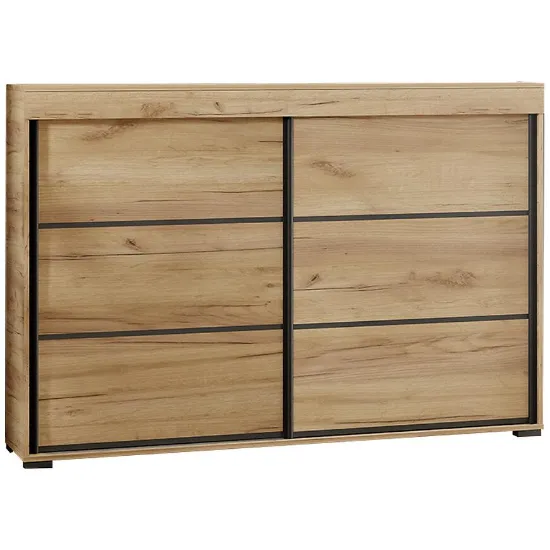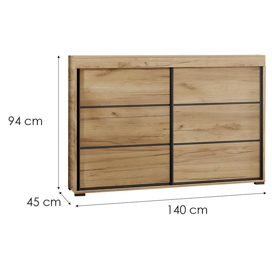 Dwudrzwiowa forma komody Tanger 140 Dąb Craft Złoty umożliwia wygodne przechowywanie różnych przedmiotów, utrzymując wnętrze w porządku. Wymiary mebla – szerokość 140 cm, wysokość 94 cm i głębokość 45 cm – zapewniają dużą pojemność przy zachowaniu kompaktowych proporcji. Zamykane fronty chronią przechowywane rzeczy i nadają komodzie schludny, elegancki wygląd.