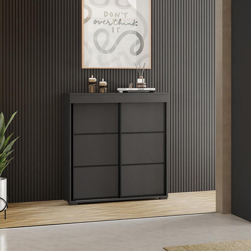 Komoda Tanger 80 Grafit to połączenie nowoczesnego designu, funkcjonalności i trwałości. Matowe wykończenie i grafitowy kolor nadają meblowi eleganckiego charakteru, a dwudrzwiowa konstrukcja zapewnia wygodne przechowywanie.