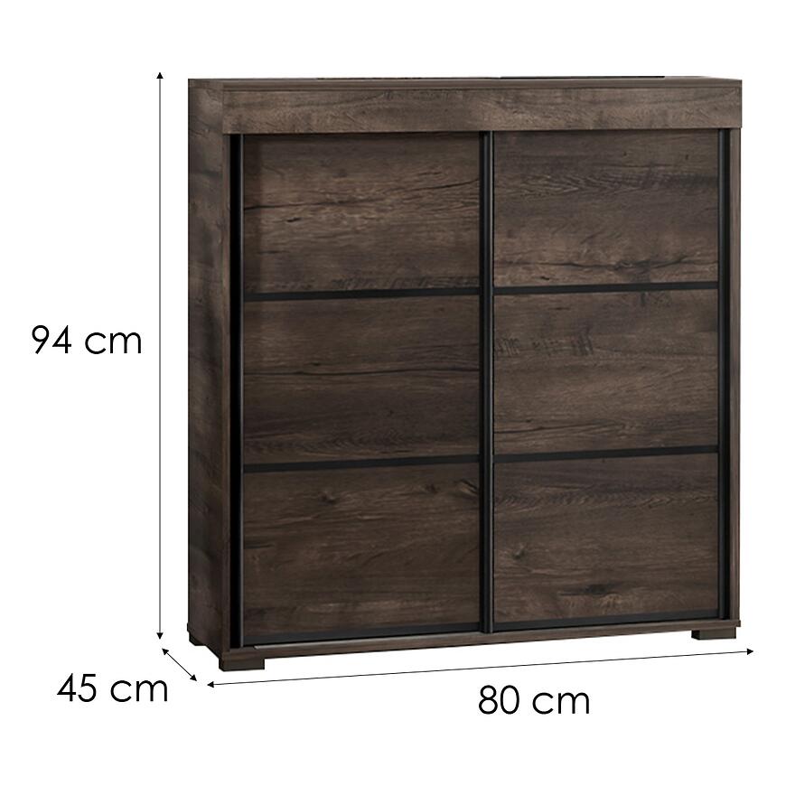 Komoda dwudrzwiowa o szerokości 80 cm zapewnia wygodny dostęp do wnętrza, umożliwiając przechowywanie różnorodnych przedmiotów. Zamykane fronty pomagają zachować porządek i schludny wygląd. Wysokość 94 cm i głębokość 45 cm gwarantują dużą pojemność przy zachowaniu kompaktowych wymiarów.