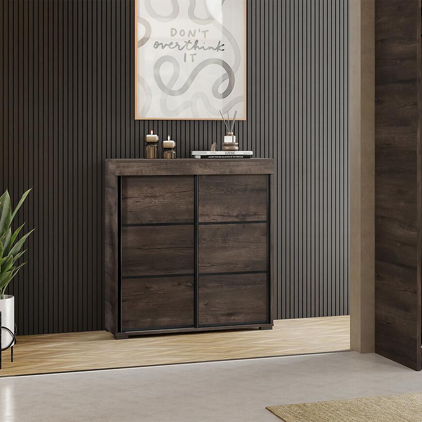 Brak dodatkowego oświetlenia oraz minimalistyczna forma podkreślają nowoczesny charakter komody i czynią ją uniwersalnym meblem w różnych aranżacjach.