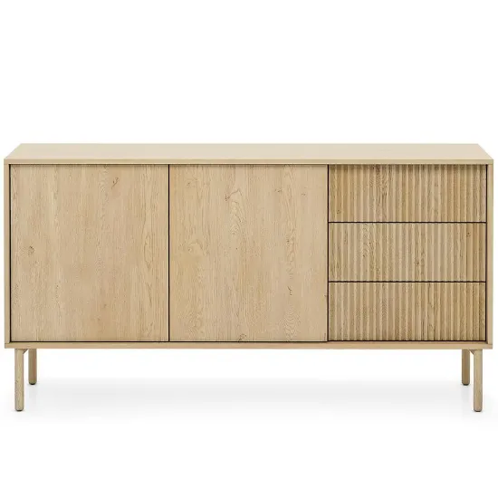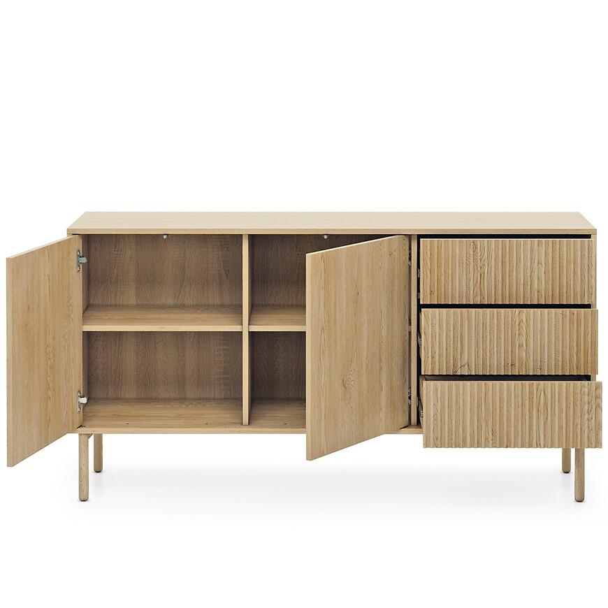 Bryła o szerokości 153,5 cm, wysokości 79,8 cm i głębokości 39,5 cm zapewnia optymalne proporcje i przestrzeń do przechowywania. Dwudrzwiowa konstrukcja w połączeniu z trzema szufladami pozwala na wygodne segregowanie i organizowanie przedmiotów, utrzymując wnętrze w porządku.