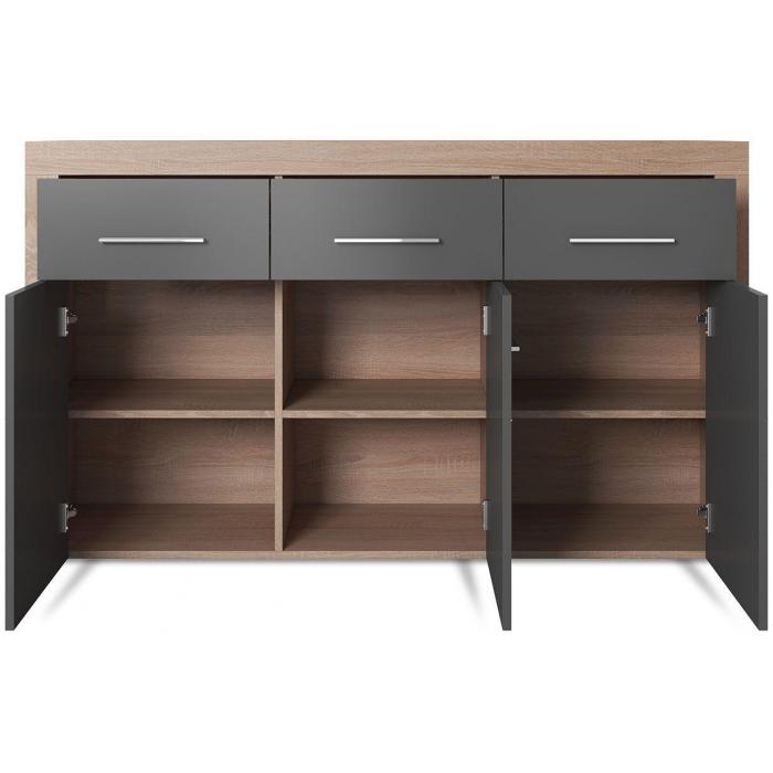 Trzydrzwiowa komoda Titto 1 to połączenie nowoczesnego stylu z eleganckim wykończeniem. Mebel wpisuje się w charakter aktualnych trendów i na pewno sprawdzi się we wnętrzach utrzymanych w estetyce klasycznej i modernistycznej. Jest podzielony na część szuflad oraz półek, które są wytrzymałe nawet przy większym obciążeniu. Komoda Titto 1 będzie zatem stanowić funkcjonalny element wyposażenia sypialni, garderoby oraz salonu. Połączenie kolorystyki dębu z antracytem wpływa na nietypowy charakter mebla. Użytkowników zachwyca także wysoka jakość, na którą składa się solidna płyta laminowana oraz metalowe uchwyty. Szerokie możliwości aranżacyjne sprawiają, że komoda będzie jednym z Twoich ulubionych mebli.