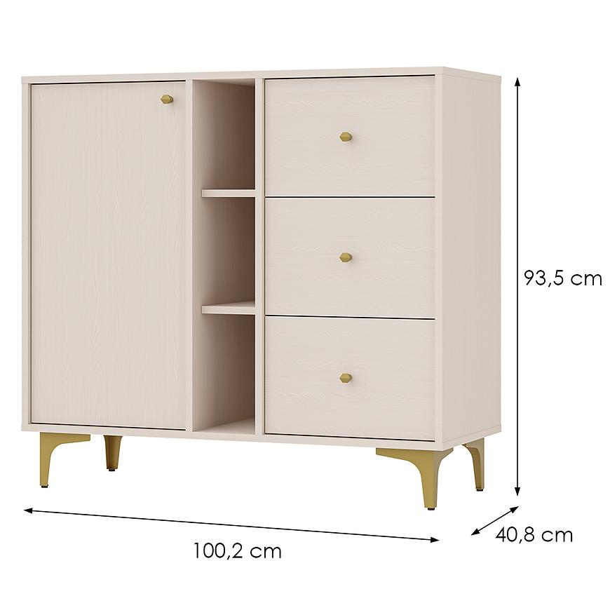 Pomimo niewielkich rozmiarów, komoda oferuje dużą pojemność. Trzy szuflady zapewniają odpowiednią przestrzeń do przechowywania, idealną do organizacji mniejszych przedmiotów, takich jak akcesoria czy bielizna. Jedna jednodrzwiowa szafka pozwala na przechowywanie większych rzeczy, takich jak książki, dokumenty lub odzież. Praktyczny układ wnętrza komody zapewnia wygodę użytkowania i sprawia, że wszystkie niezbędne przedmioty są zawsze pod ręką.