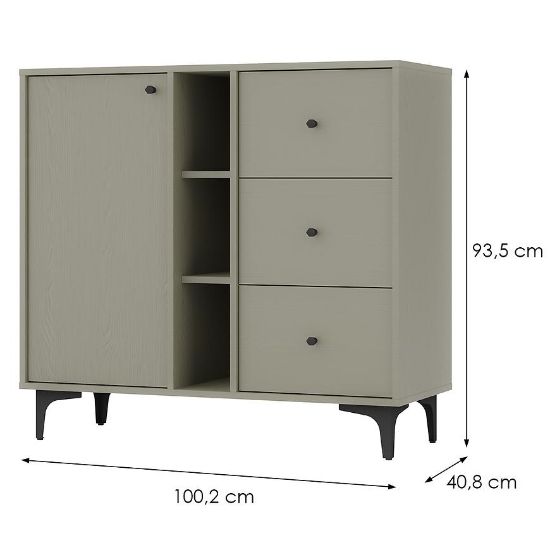 Pomimo niewielkich rozmiarów, komoda oferuje dużą pojemność. Trzy szuflady zapewniają odpowiednią przestrzeń do przechowywania, idealną do organizacji mniejszych przedmiotów, takich jak akcesoria czy bielizna. Jedna jednodrzwiowa szafka pozwala na przechowywanie większych rzeczy, takich jak książki, dokumenty lub odzież. Praktyczny układ wnętrza komody zapewnia wygodę użytkowania i sprawia, że wszystkie niezbędne przedmioty są zawsze pod ręką.