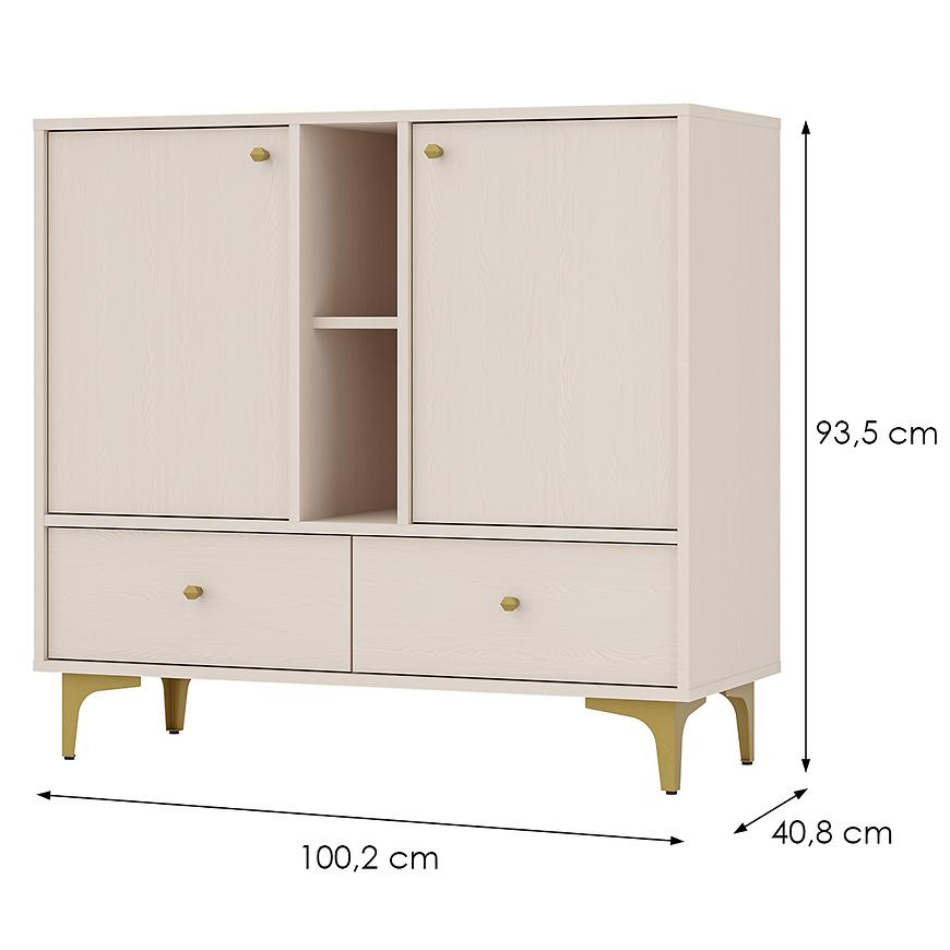 Pomimo niewielkich rozmiarów, komoda oferuje dużą pojemność. Dwie szuflady zapewniają odpowiednią przestrzeń do przechowywania, idealną do organizacji mniejszych przedmiotów, takich jak akcesoria czy bielizna. Dwie jednodrzwiowe szafki pozwalają na przechowywanie większych rzeczy, takich jak książki, dokumenty lub odzież. Praktyczny układ wnętrza komody zapewnia wygodę użytkowania i sprawia, że wszystkie niezbędne przedmioty są zawsze pod ręką.