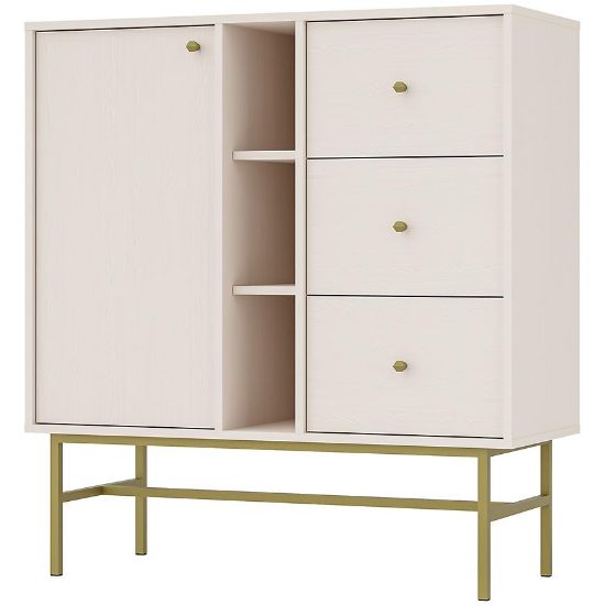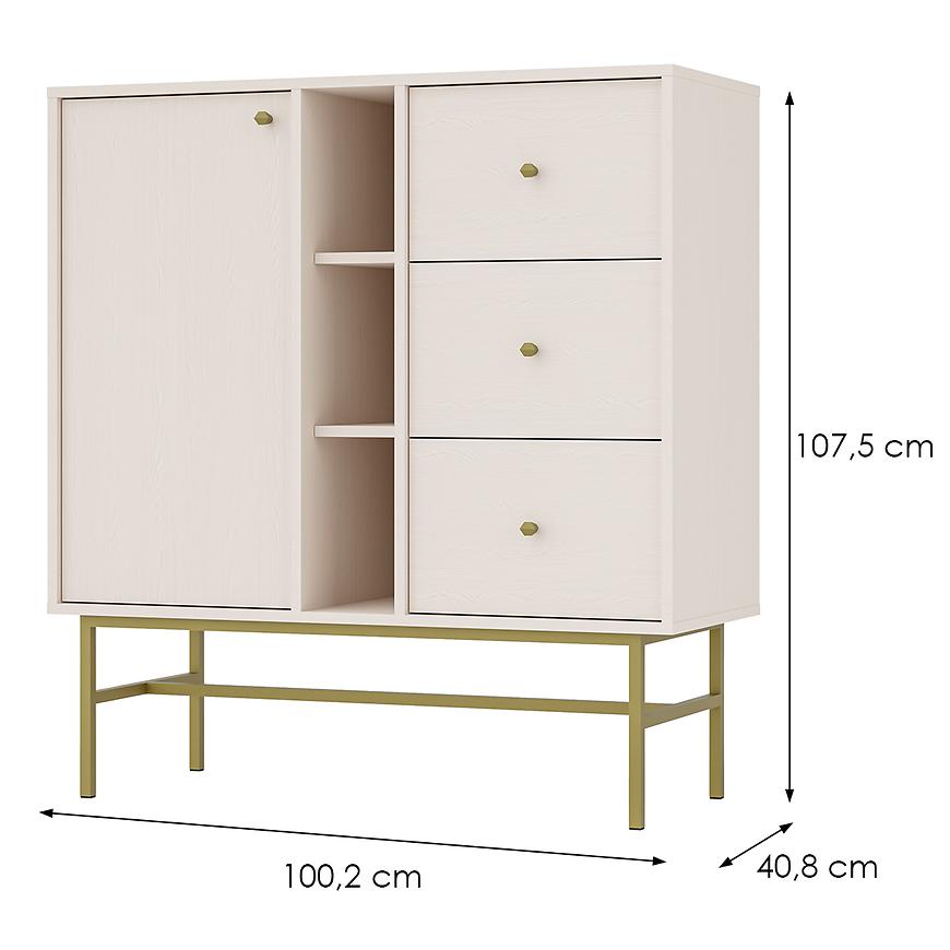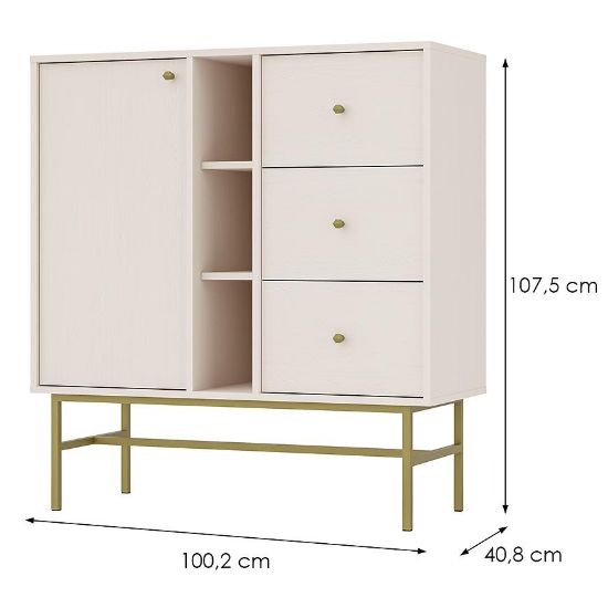 Pomimo niewielkich rozmiarów, komoda oferuje dużą pojemność. Trzy szuflady zapewniają odpowiednią przestrzeń do przechowywania, idealną do organizacji mniejszych przedmiotów, takich jak akcesoria czy bielizna. Jedna jednodrzwiowa szafka pozwala na przechowywanie większych rzeczy, takich jak książki, dokumenty lub odzież. Praktyczny układ wnętrza komody zapewnia wygodę użytkowania i sprawia, że wszystkie niezbędne przedmioty są zawsze pod ręką.