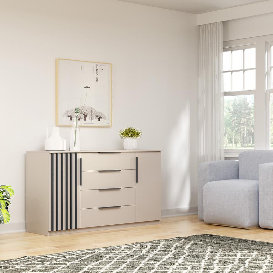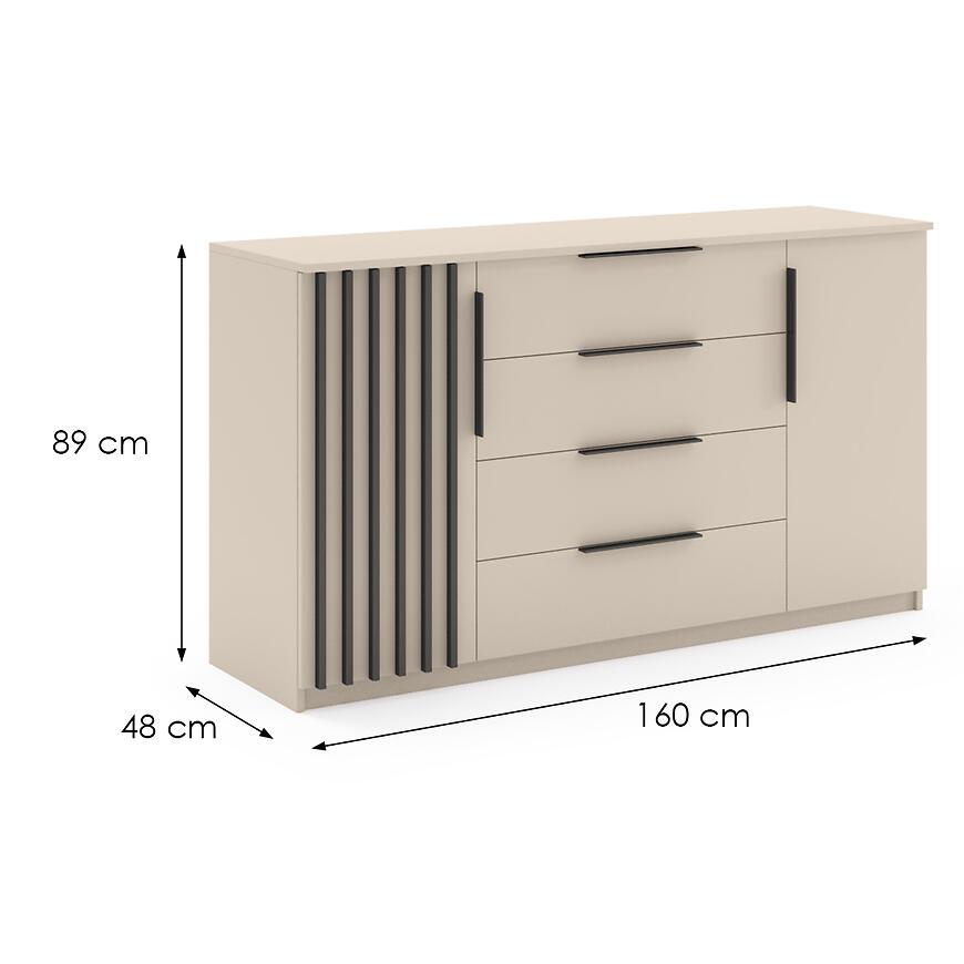 Komoda Torino II Cashmir/Lamela Czarna to loftowy i funkcjonalny mebel, wykonany z laminowanej płyty wiórowej w wybarwieniu cashmir z matowym wykończeniem. Posiada dwudrzwiową konstrukcję oraz cztery lub więcej szuflad, które umożliwiają wygodne przechowywanie różnorodnych przedmiotów. Solidna i estetyczna konstrukcja łączy trwałość z nowoczesnym designem, a kontrastowa czarna lamela dodaje komodzie wyrazistego charakteru.