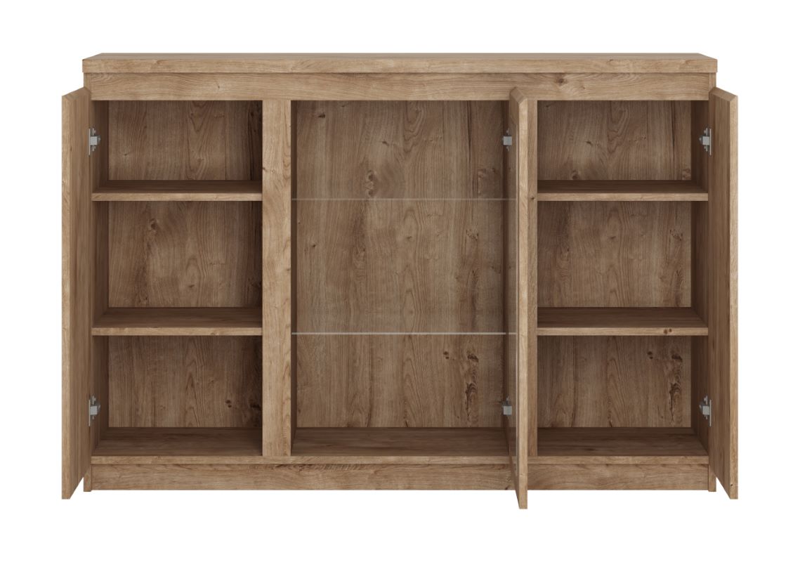 Komoda dwudrzwiowa z szufladami FRIK03 to uniwersalny mebel, który świetnie sprawdzi się zarówno w salonie, jak i jadalni. Wyposażona w cztery pojemne szuflady z systemem pełnego wysuwu oraz półki za frontami, pozwala na wygodne przechowywanie zastawy stołowej, tekstyliów czy dokumentów.