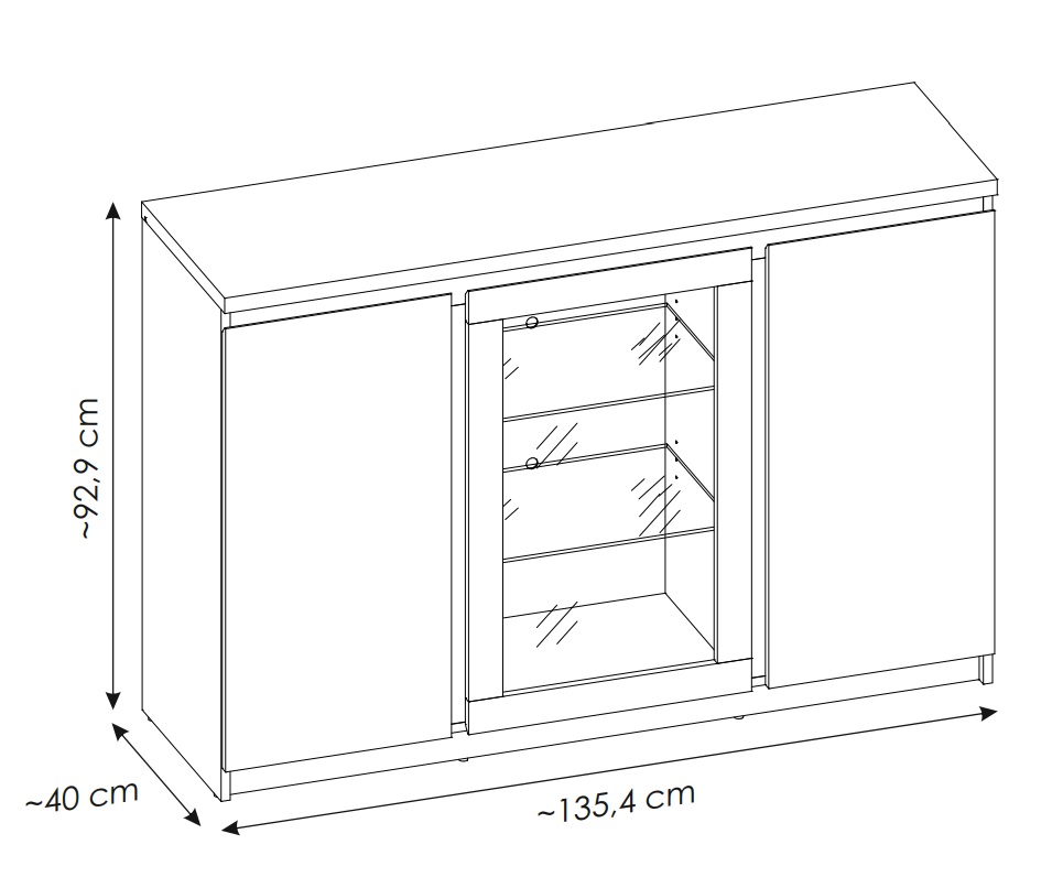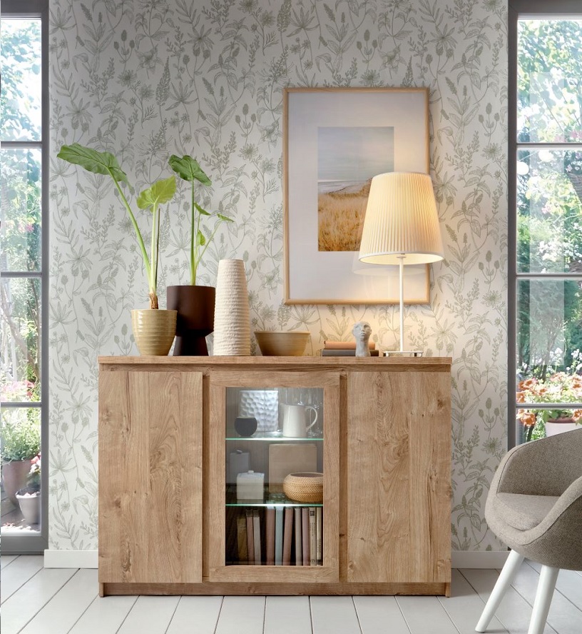 Witryna Fribo to także wygoda użytkowania – posiada trzy pojemne szuflady z pełnym wysuwem, a możliwość wyboru kierunku otwierania drzwi (lewo/prawo) sprawia, że dopasuje się do każdego wnętrza. To mebel, który zachwyca prostotą formy i ciepłym kolorem drewna, podkreślając przytulny klimat salonu lub jadalni.