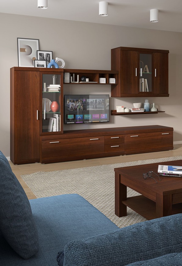 Imperial dostępny jest w głębokim, klasycznym odcieniu orzecha imperial, który nadaje meblom elegancki, lekko rustykalny wygląd. Całość została uzupełniona ozdobnymi frontami z zaokrągloną listwą MDF, co dodaje bryłom subtelnej dekoracyjności i ponadczasowego uroku. Uzupełnieniem są srebrne uchwyty z tworzywa sztucznego, które idealnie kontrastują z ciemną kolorystyką drewna, podkreślając klasyczny styl kolekcji i wprowadzając nowoczesny akcent.