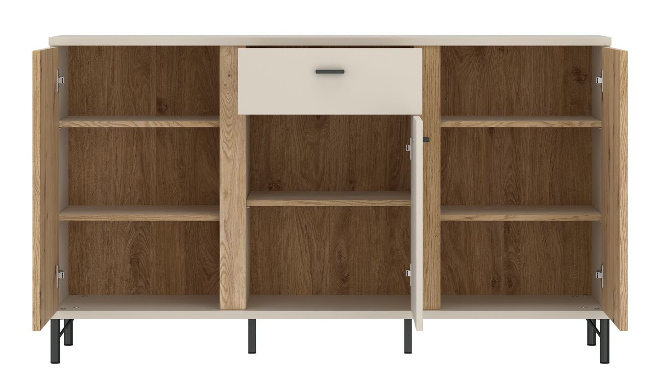 Model Mosano LUSK101 ma 150 cm szerokości i 40 cm głębokości, dzięki czemu zachowuje zgrabne proporcje przy jednoczesnym oferowaniu zaskakująco pojemnego wnętrza. Komoda wyposażona jest w trzy zamykane szafki, idealne na akcesoria domowe, dokumenty lub zastawę stołową. W centralnej części umieszczono jedną szufladę, która świetnie sprawdzi się do przechowywania rzeczy używanych na co dzień – pilotów, notesów, tekstyliów czy drobnych gadżetów.