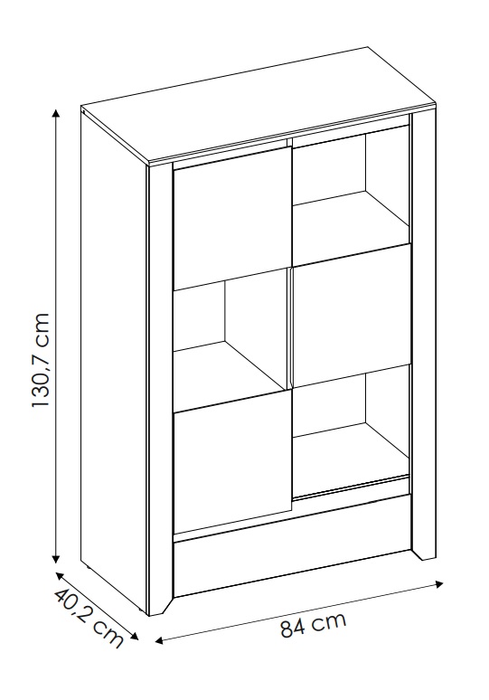 Wymiary komody (szerokość: 84 cm, wysokość: 130,7 cm, głębokość: 40,2 cm) zapewniają dużą pojemność przy zachowaniu smukłej formy, która nie przytłacza przestrzeni. Wewnątrz znajdują się trzy zamykane szafki oraz praktyczna szuflada, idealna do przechowywania drobnych akcesoriów, dokumentów lub tekstyliów.