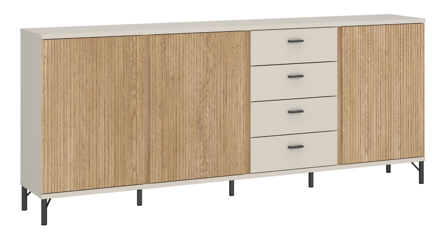 Bryła wyróżnia się szerokością 200 cm, co czyni ją meblem idealnym do przestronnych salonów i jadalni. Użytkownik może zdecydować, czy komoda będzie prezentowała się bardziej masywnie i stabilnie na pełnym cokole, czy też zyska lekkość dzięki metalowym nóżkom. Obie opcje dołączone są do zestawu, co ułatwia dopasowanie mebla do konkretnego wnętrza i przewidywanego stylu aranżacji.