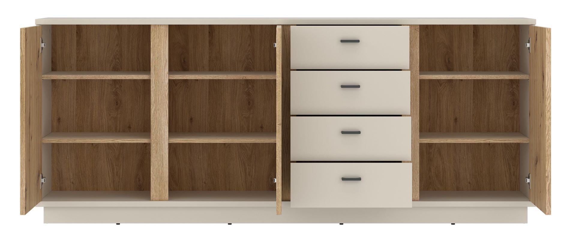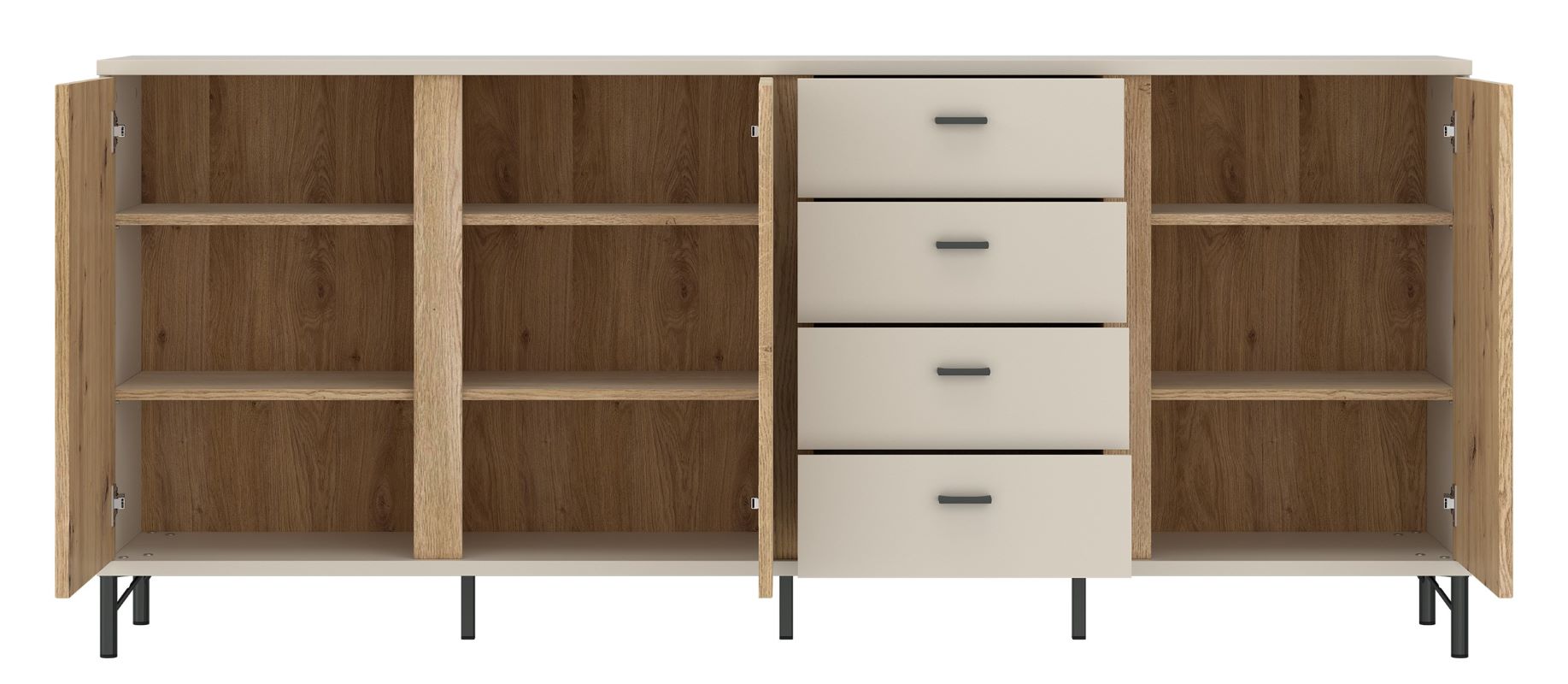 Wnętrze komody Mosano LUSK103 zostało zaplanowane tak, aby pomieścić zarówno drobne akcesoria, jak i tekstylia czy zastawę stołową. Model oferuje trzy zamykane szafki oraz cztery szuflady, które ułatwiają utrzymanie porządku w codziennym użytkowaniu. Dzięki głębokości 40 cm komoda nie przytłacza pomieszczenia, jednocześnie zapewniając dużą pojemność.