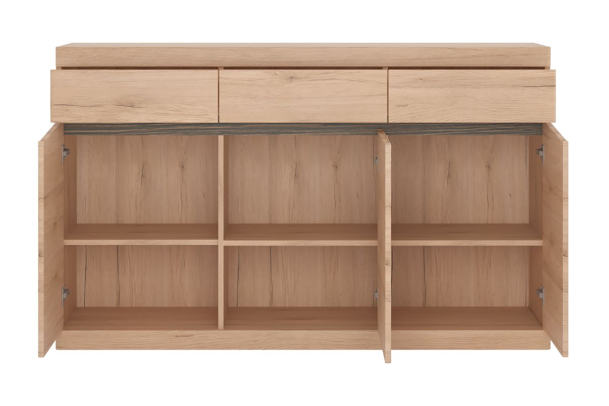 Efektowny, drewnopodobny dekor zachwyca realistycznym usłojeniem, które przywołuje na myśl ciepło natury. Kontrastowe wcięcia, pełniące rolę uchwytów, dodają kolekcji wyrazistego charakteru i podkreślają nowoczesną linię mebli. Przykuwają uwagę także szerokie poziome listwy, które świetnie współgrają z masywnymi frontami wykonanymi z trwałego MDF-u.