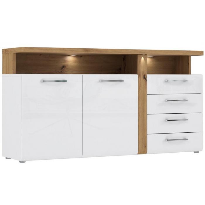 Doskonałym wyborem będzie komoda w kolorze biały/dąb artisan materiał wykonania to płyta wiórowa. Mebel posiada funkcjonalny blat, który można wykorzystać np. charakterze miejsca na telewizor. Komoda posiada drzwiczki dzięki czemu ma łatwy dostęp do wnętrza, a także szuflady oraz półki. Dodatkowym atutem jest oświetlenie w zestawie.