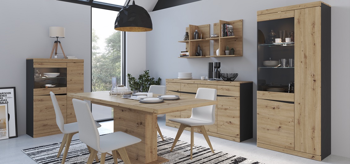 Jedną z najbardziej wyróżniających cech komody Turino TURS02 jest jej wybarwienie. Dostępna w kolorze dąb artisan w połączeniu z antracytem, komoda ta wnosi nowoczesność i elegancję do każdego pomieszczenia. Kombinacja naturalnego drewna z głębokim odcieniem antracytu tworzy harmonijną całość, która doskonale komponuje się zarówno z innymi meblami, jak i z różnymi stylami dekoracji wnętrz.