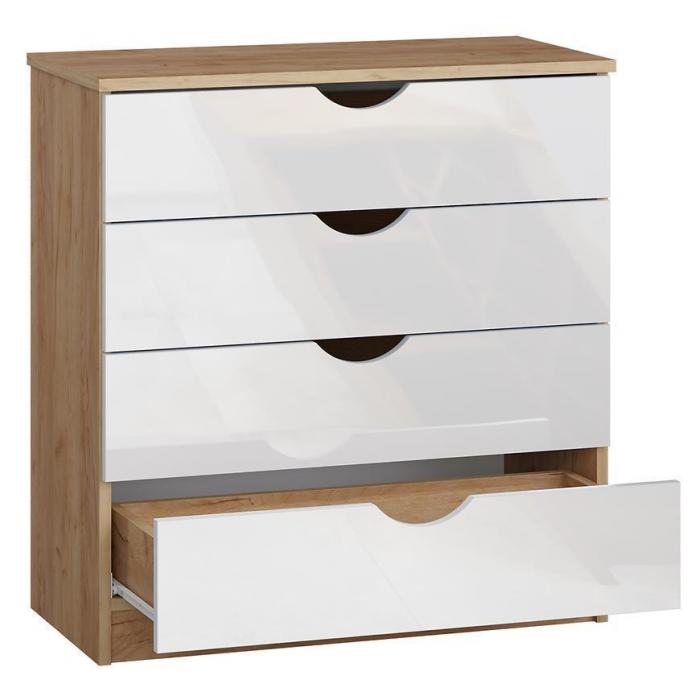 Doskonałym wyborem do pokoju dziennego, czy młodzieżowego będzie komoda w kolorze dąb craft złoty/biały, materiał wykonania to płyta MDF/płyta laminowana. Komoda posiada cztery szuflady dzięki czemu ma łatwy dostęp do wnętrza. Komoda dopełni również wystrój salonu, czy przedpokoju, stanowiąc wygodne miejsce do przechowywania mniejszych i większych rzeczy. Mebel do samodzielnego montażu.