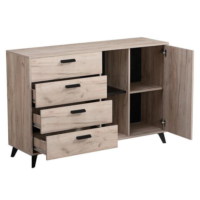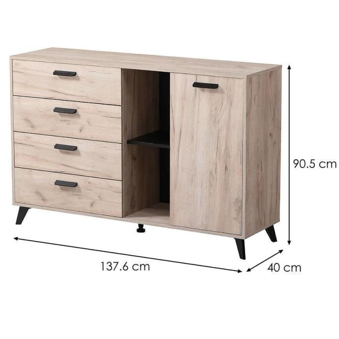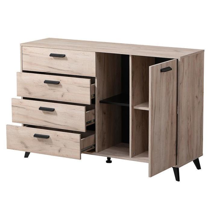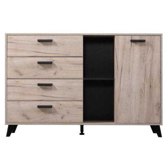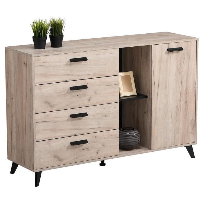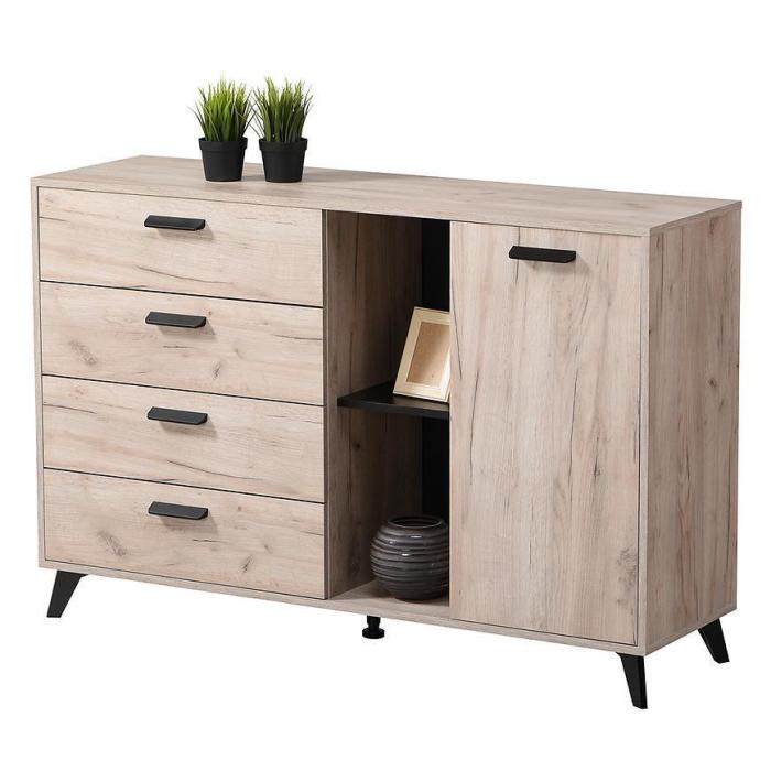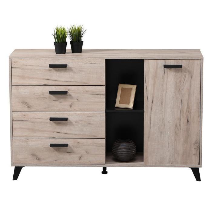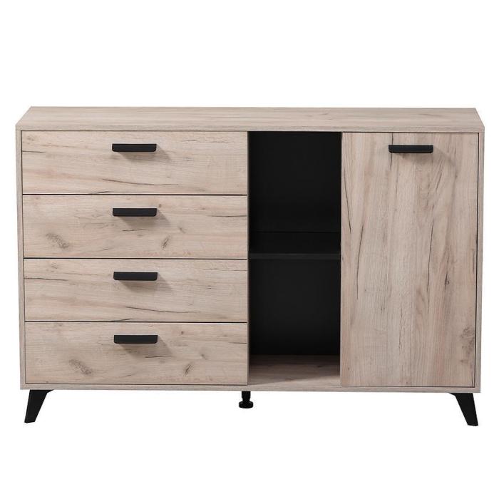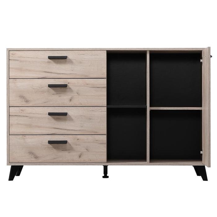 Komoda UMBRIA to doskonała propozycja do sypialni lub do przedpokoju. Doskonale sprawdzi się również w pokoju dziennym. Posiada cztery pojemne szuflady oraz uchylne drzwi. Wykonana w płyty wiórowej laminowanej. Komoda oferuje funkcjonalne wnętrze, a ponadto wyróżnia się nowoczesnym stylem.