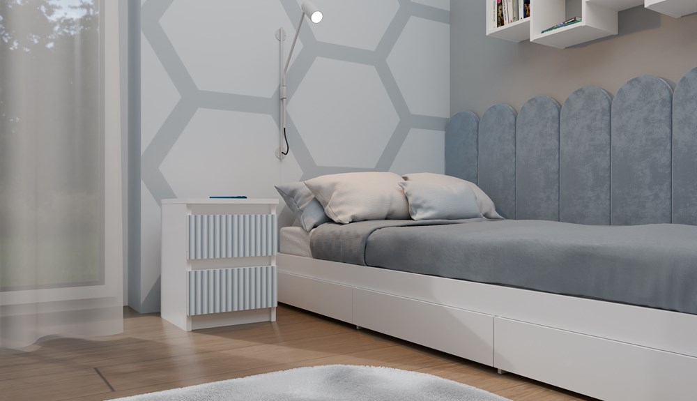 Front komody w delikatnym niebieskim odcieniu dodaje wnętrzu subtelności i przyjemnej atmosfery. Pionowe wzory nadrukowane na frontach szuflad w kolorze niebieskim, dzięki nowoczesnej technologii, nadają komodzie indywidualny charakter, będący doskonałym uzupełnieniem modernistycznego wnętrza.
