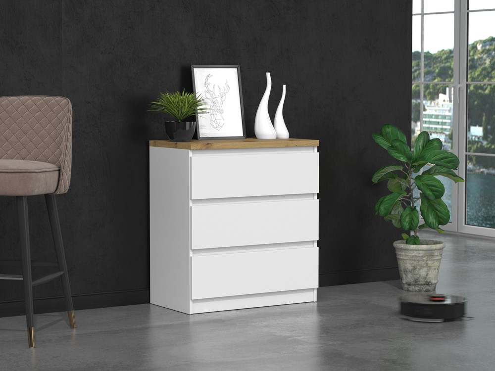 Nie ma dobrze wyposażonego, funkcjonalnego mieszkania bez pojemnej komody, takiej jak komoda Umo P3. Składa się ona z trzech ergonomicznie zaprojektowanych szuflad, dzięki czemu pojemność idzie w parze z kompaktowymi wymiarami. Komoda Umo P3 swoim designem wyraźnie nawiązuje do prostoty i funkcjonalności stylu scandi, ale będzie też pasować do wnętrz nowoczesnych, minimalistycznych czy prowansalskich. Komoda Umo P3 znajdzie zastosowanie jako mebel do salonu, sypialni, pokoju młodzieżowego, ale również jako komoda biurowa na dokumenty. Płyta laminowana o grubości 16 mm, z której została wykonana, przesądza o jej wytrzymałości, solidności oraz odporności na zniszczenia. Co ważne, jest także łatwa do utrzymania w czystości. Mebel do samodzielnego montażu.