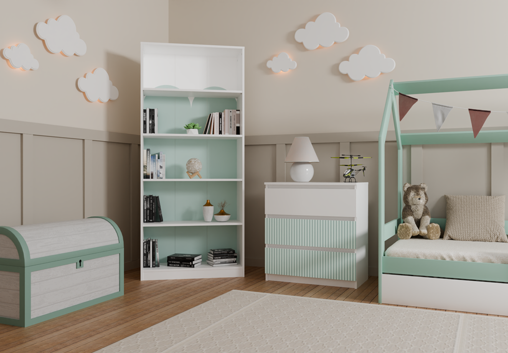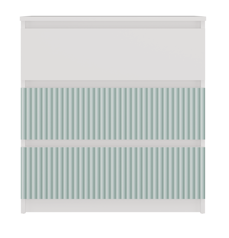 Front komody, również w odcieniach białym i miętowym, dodaje odrobinę koloru i radości, idealnie wpasowując się w młodzieżowy styl. Dwie dolne szuflady ozdobione są pionowymi wzorami w miętowym kolorze, nadrukowanymi nowoczesną technologią, co nadaje meblowi unikalny charakter.