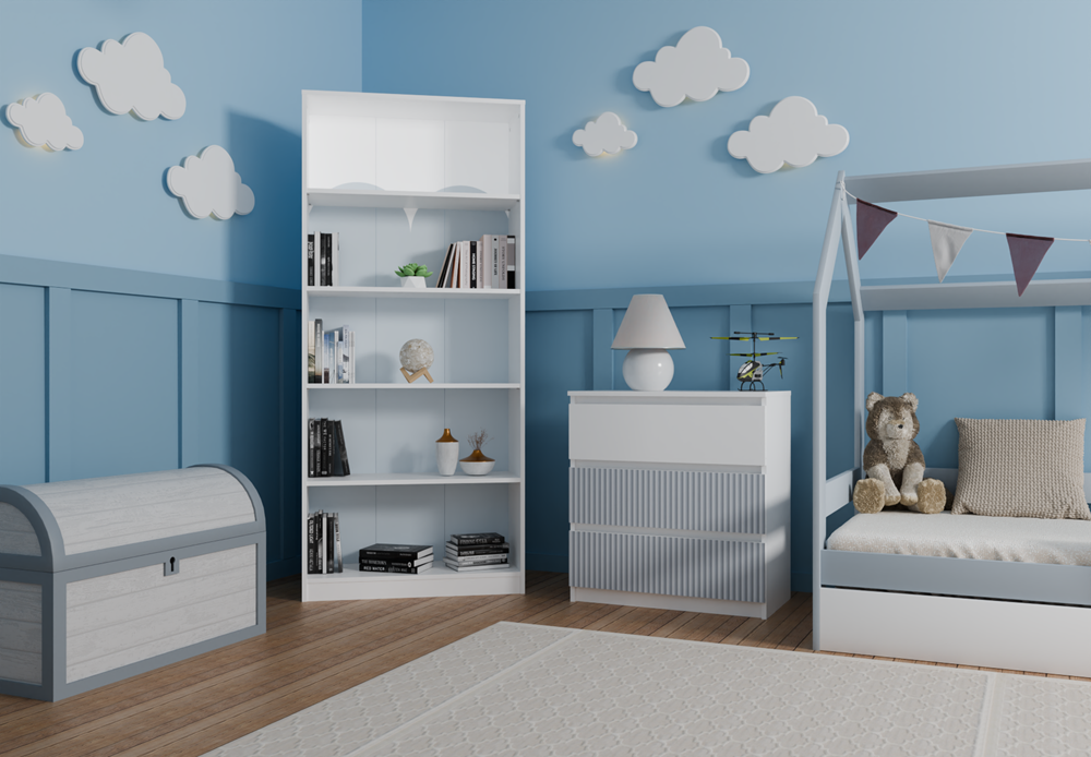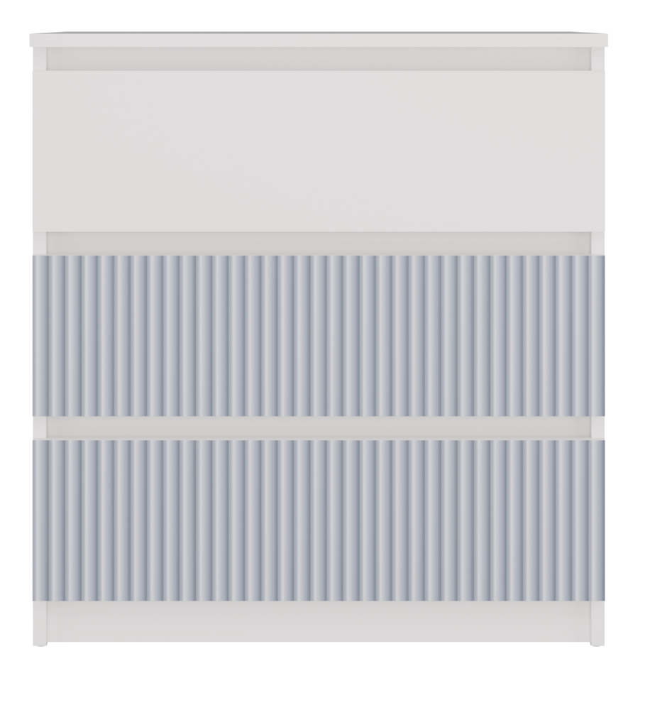 Front komody, również w odcieniach białym i niebieskim, dodaje odrobinę koloru i radości, idealnie wpasowując się w młodzieżowy styl. Dwie dolne szuflady ozdobione są pionowymi wzorami w niebieskim kolorze, nadrukowanymi nowoczesną technologią, co nadaje meblowi unikalny charakter.