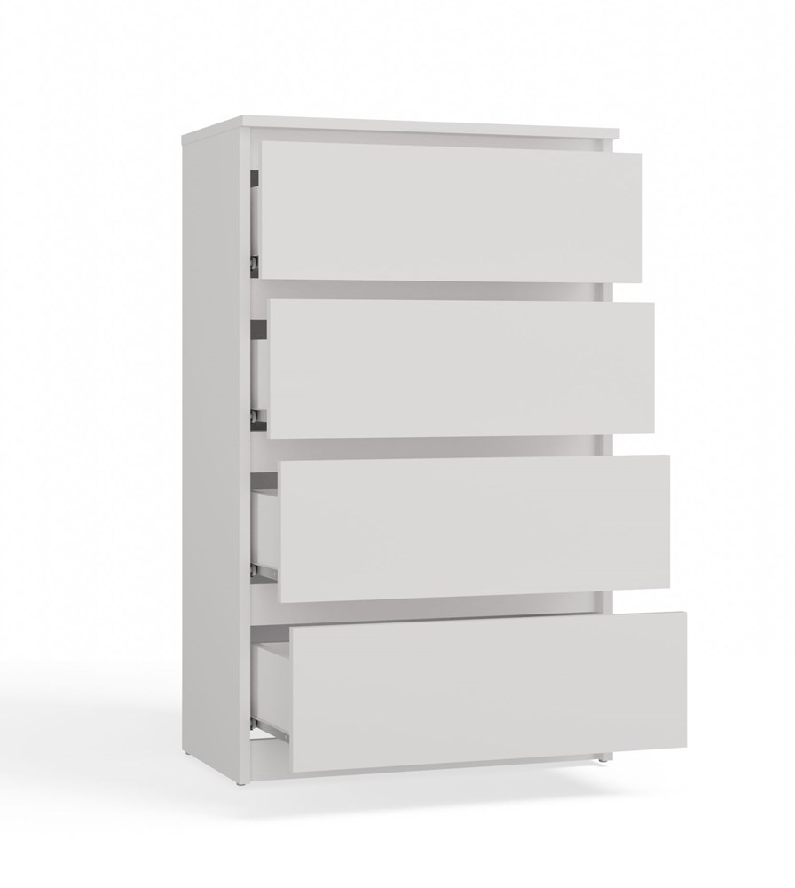 Komoda Umo w kolorze białym to funkcjonalny i stylowy mebel, który doskonale sprawdzi się w każdym wnętrzu. Wyposażona w cztery szuflady, stanowi idealne miejsce do przechowywania wszystkich niezbędnych przedmiotów, takich jak okulary, ulubiona książka czy telefon.