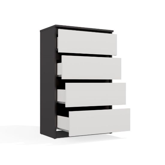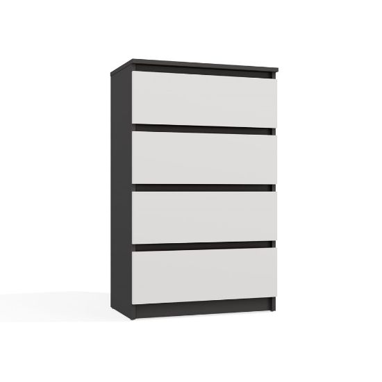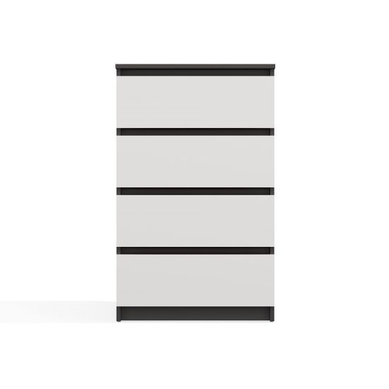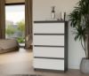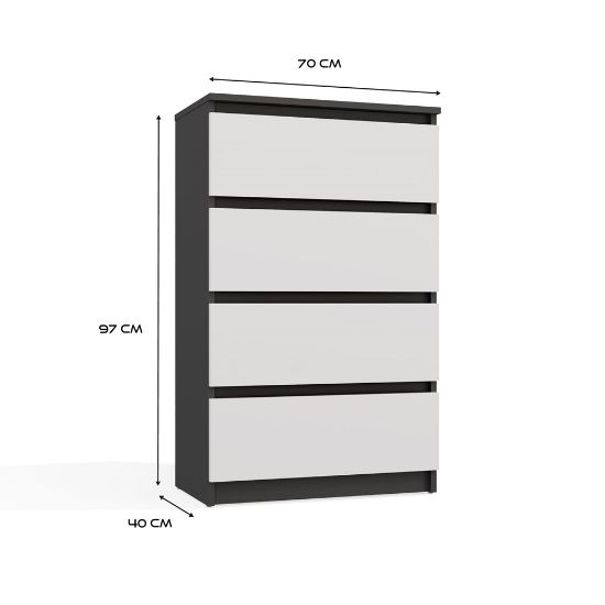 Komoda Umo w kolorze antracyt/biały to funkcjonalny i stylowy mebel, który doskonale sprawdzi się w każdym wnętrzu. Wyposażona w cztery pojemne szuflady, stanowi idealne miejsce do przechowywania wszystkich niezbędnych przedmiotów, takich jak okulary, ulubiona książka czy telefon.