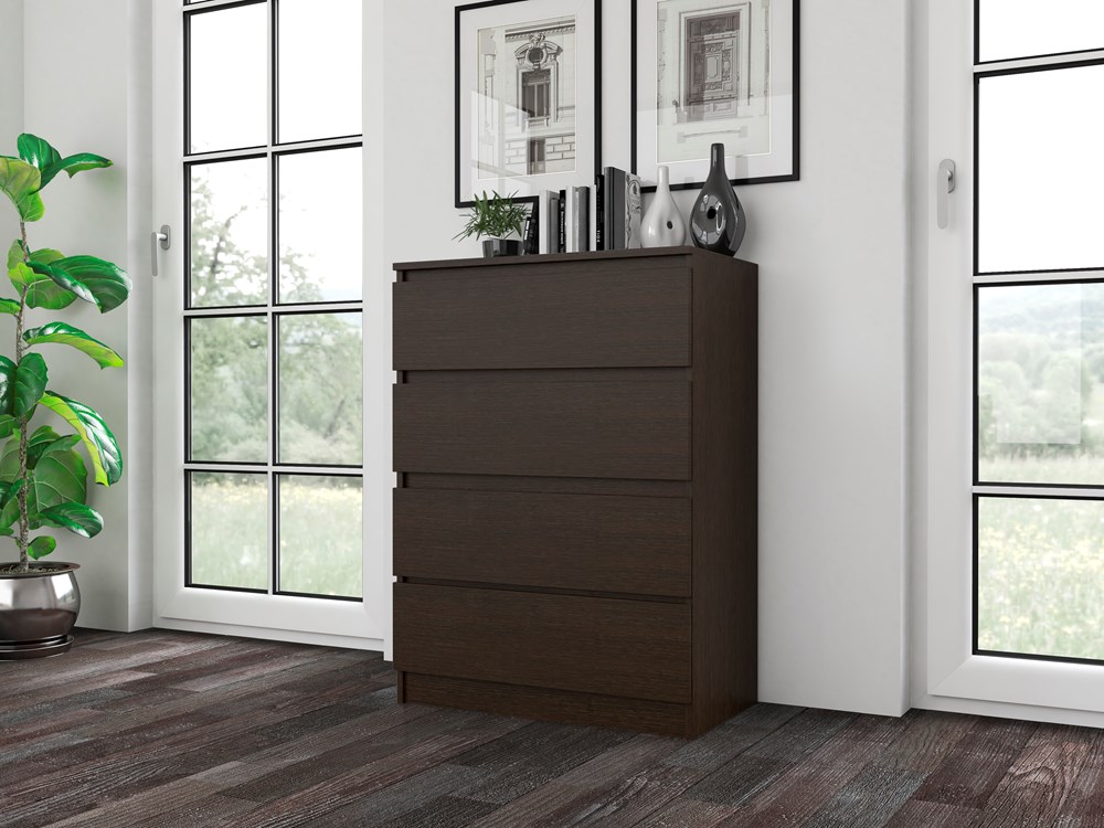 Nie ma dobrze wyposażonego, funkcjonalnego mieszkania bez pojemnej komody, takiej jak komoda Umo P4. Składa się ona z czterech ergonomicznie zaprojektowanych szuflad, dzięki czemu pojemność idzie w parze z kompaktowymi wymiarami (70x40x97 cm). Komoda Umo P4 swoim designem wyraźnie nawiązuje do prostoty i funkcjonalności stylu scandi, ale będzie też pasować do wnętrz nowoczesnych, minimalistycznych czy prowansalskich. Komoda Umo P4 znajdzie zastosowanie jako mebel do salonu, sypialni, pokoju młodzieżowego, ale również jako komoda biurowa na dokumenty. Płyta laminowana o grubości 16 mm, z której została wykonana, przesądza o jej wytrzymałości, solidności oraz odporności na zniszczenia. Co ważne, jest także łatwa do utrzymania w czystości. Mebel do samodzielnego montażu.