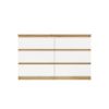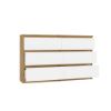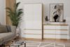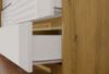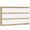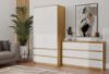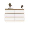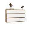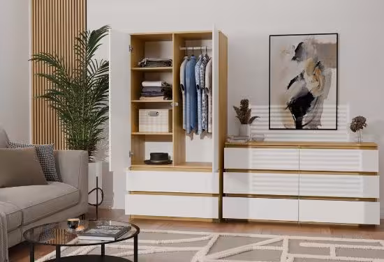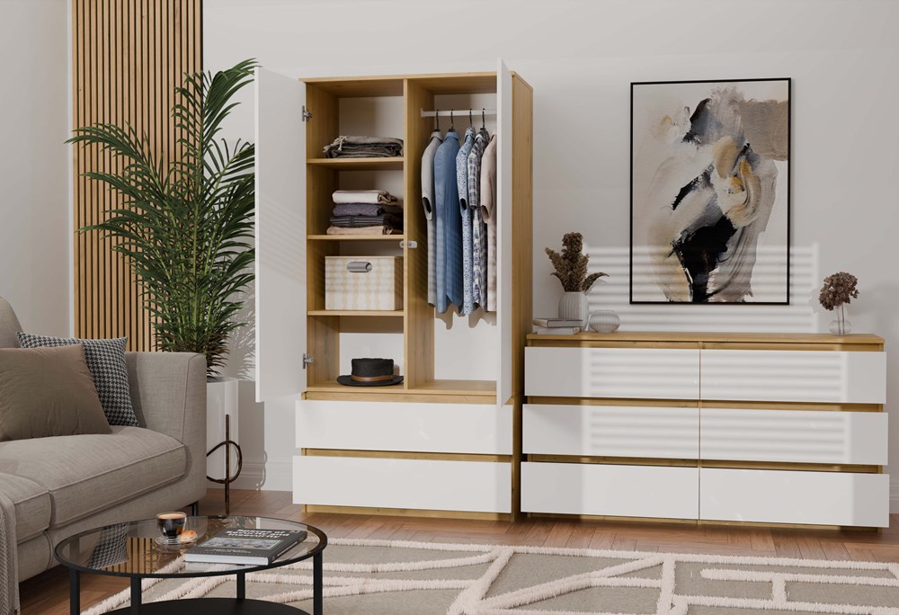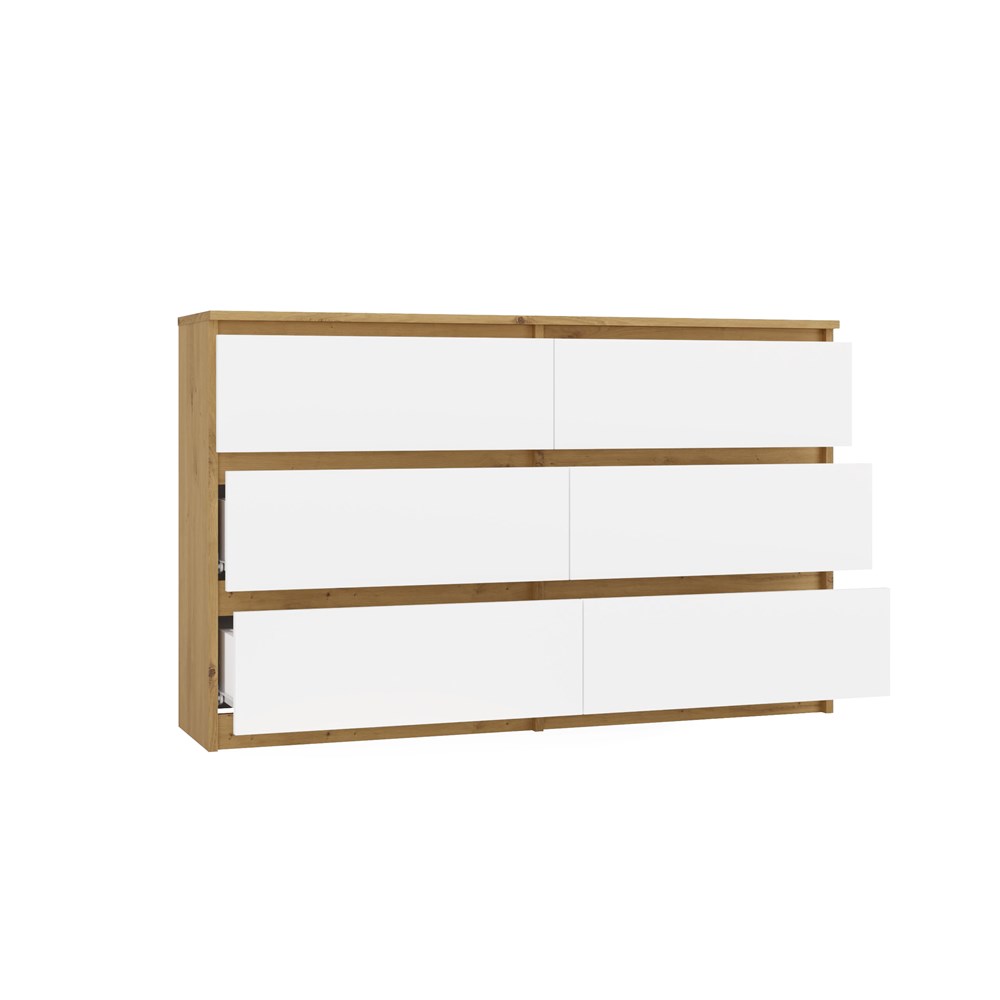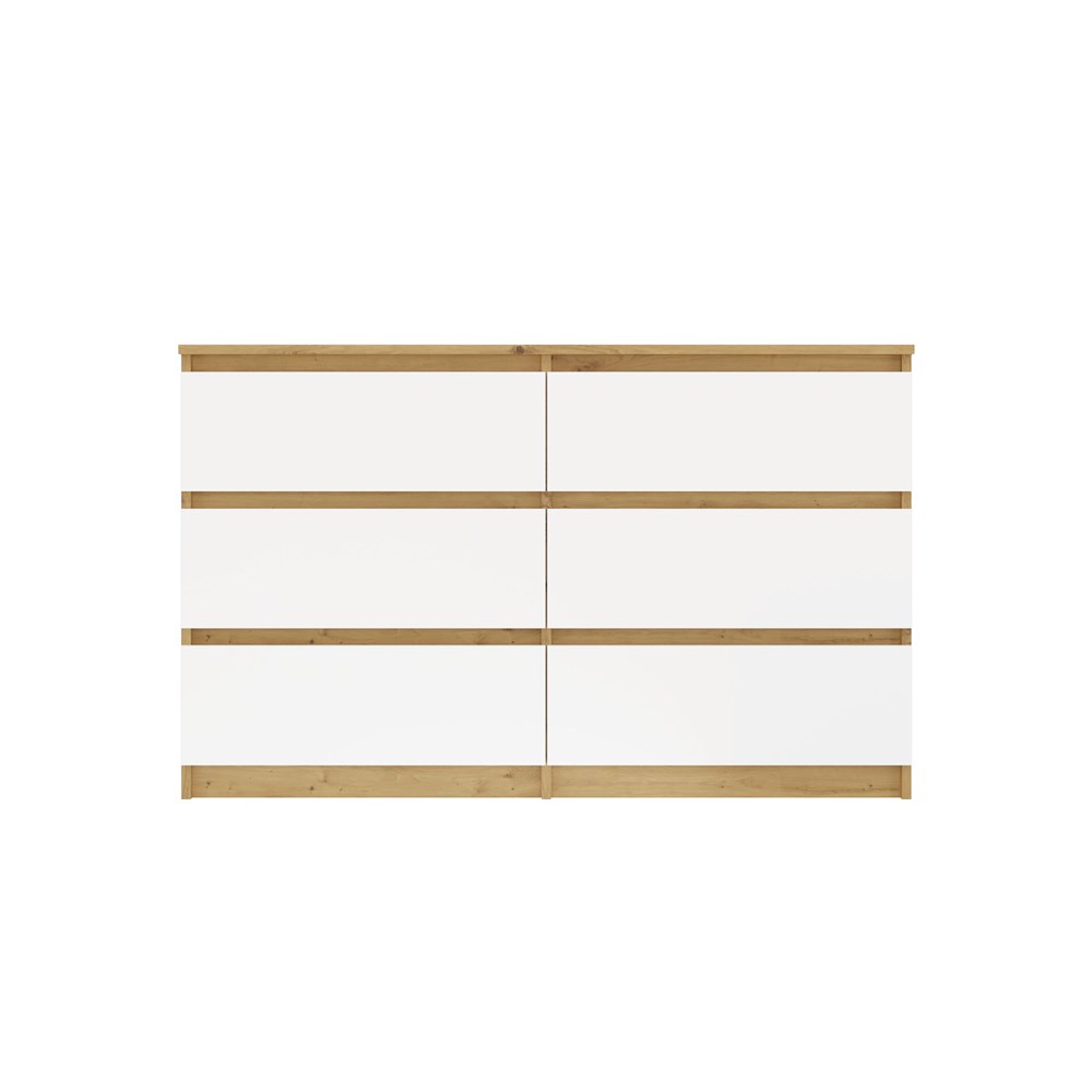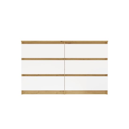 Komoda posiada 6 pojemnych szuflad osadzonych na prowadnicach rolkowych z blokadą, co zapewnia płynne, ciche i bezpieczne wysuwanie. Bezuchwytowe fronty w białym kolorze nadają meblowi minimalistyczny charakter, a korpus w odcieniu dąb artisan dodaje wnętrzu ciepła i naturalnego wyglądu.