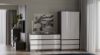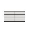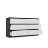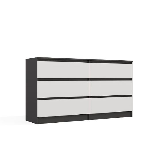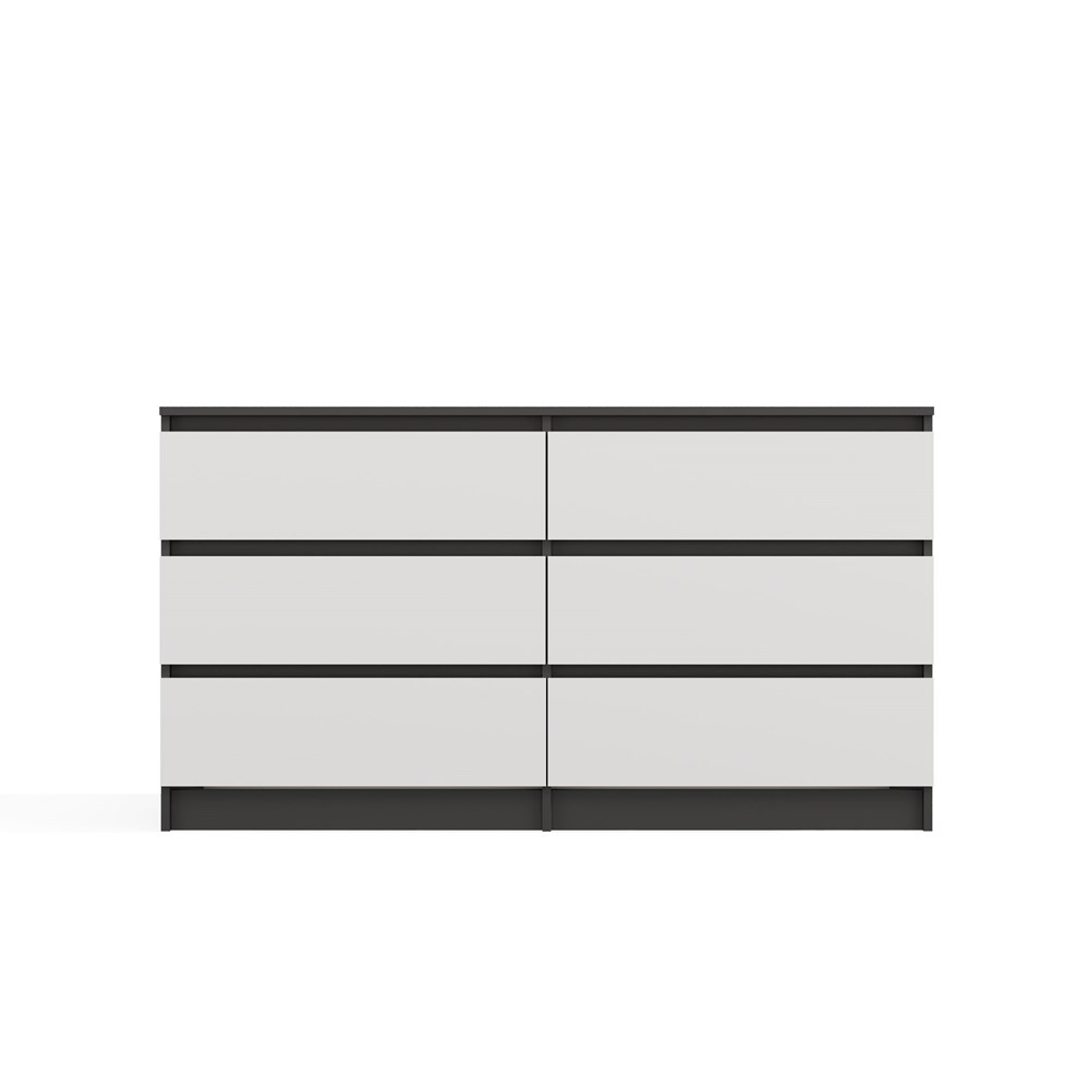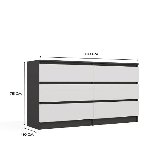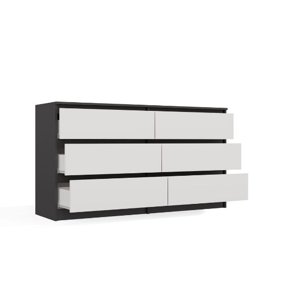 Komoda posiada 6 pojemnych szuflad osadzonych na prowadnicach rolkowych z blokadą, co zapewnia płynne, ciche i bezpieczne wysuwanie. Bezuchwytowe fronty w białym kolorze nadają meblowi minimalistyczny charakter, a korpus w odcieniu antracyt dodaje wnętrzu wyglądu.