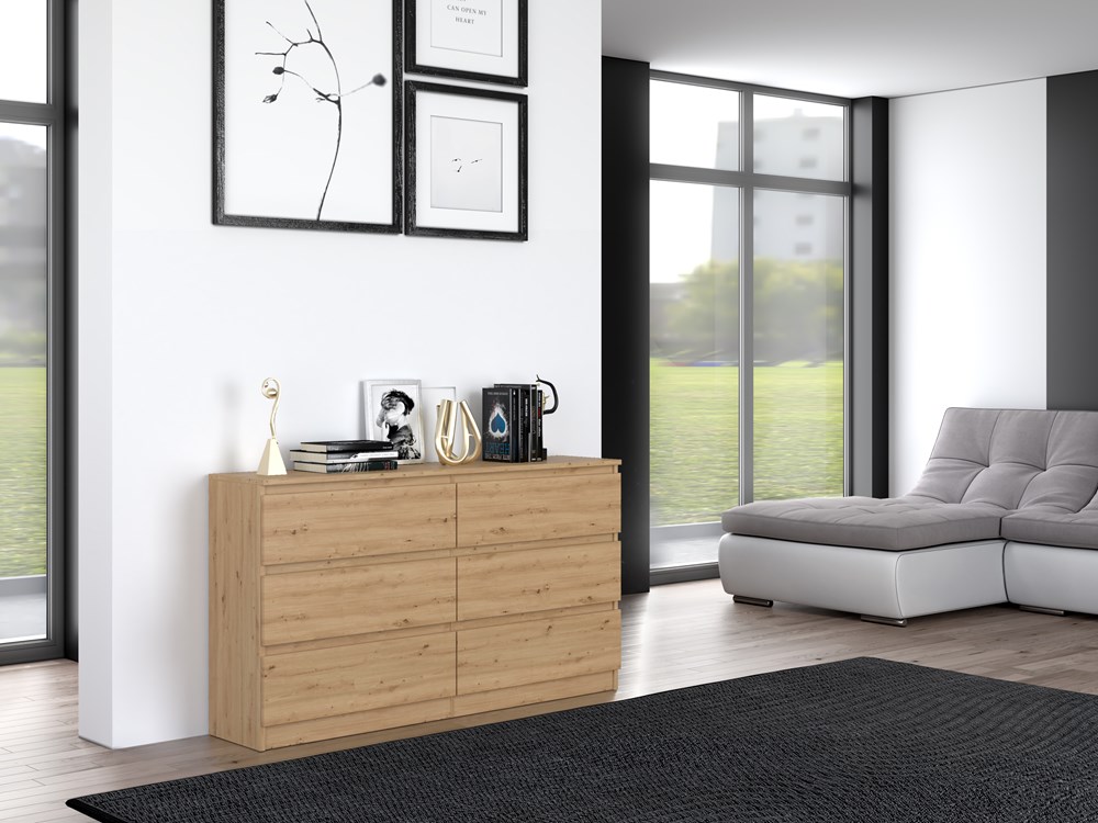 Prostota i skandynawski design, tak można w dwóch słowach opisać komody z serii Umo. Komoda Umo 6 140 składa się z 6 szuflad , bardzo elegancka, niezwykle pojemna i czarująca swoją minimalistyczną formą. Taka właśnie jest komoda Umo, stworzona z myślą o zagospodarowaniu różnego rodzaju wnętrz - od przestronnego salonu, sypialni, pokoju gościnnego czy młodzieżowego, jak również długiego holu. Czarujący kolor i pojemne szuflady komody to rozwiązanie nie tylko funkcjonalne, ale i maksymalnie sprawdzone. Mebel ten wykonano z wysokiej jakości płyty laminowanej, mogącej z powodzeniem służyć przez wiele lat. Komoda Umo to mebel na tyle uniwersalny, że z powodzeniem znaleźć się może w każdym mieszkaniu czy domu. Mebel do samodzielnego montażu