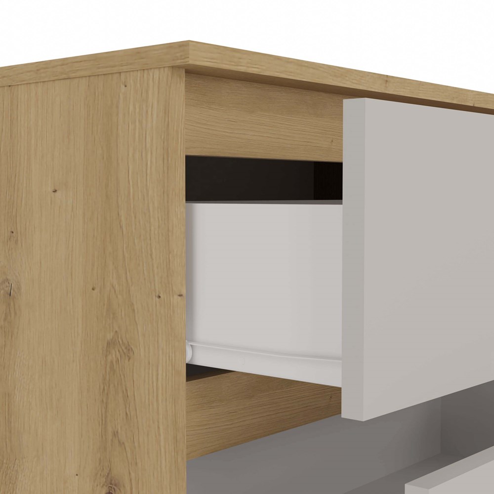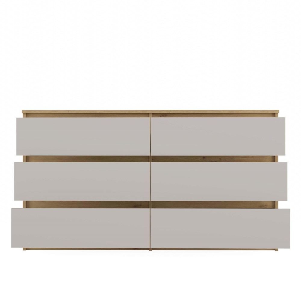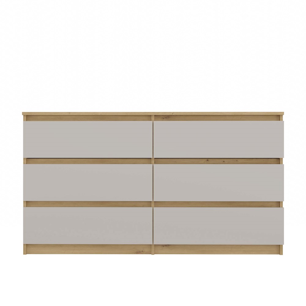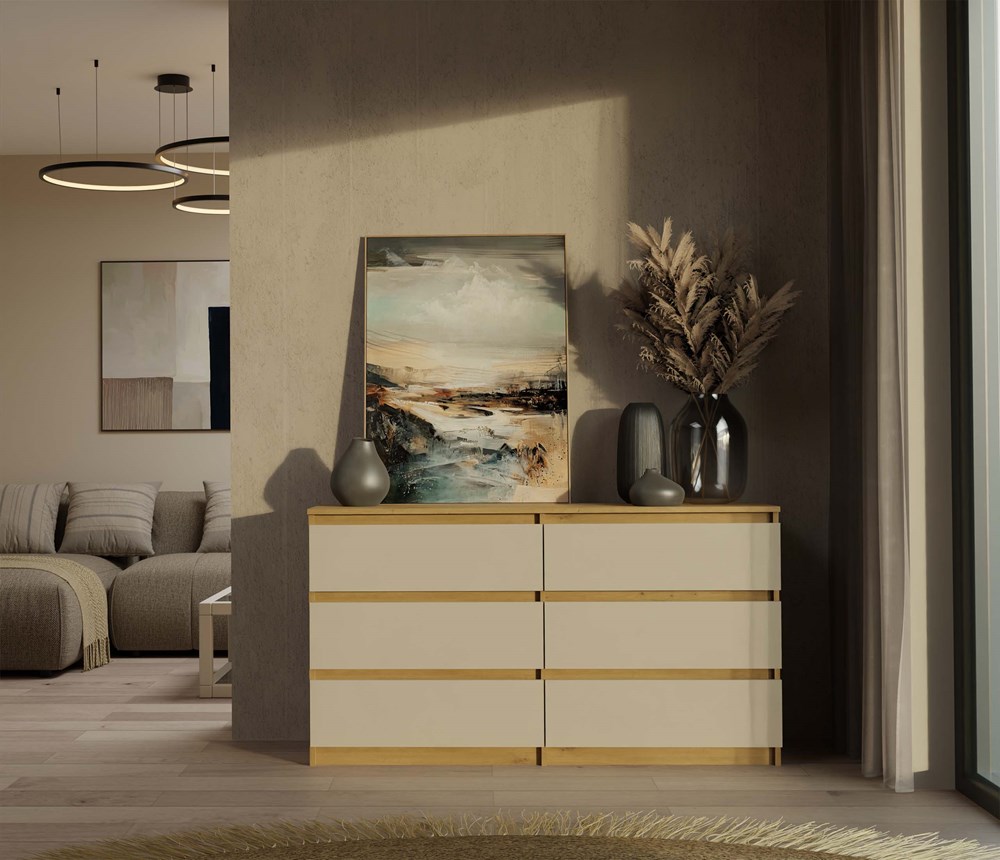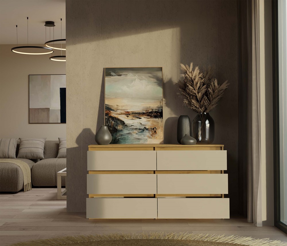 Komoda posiada 6 pojemnych szuflad osadzonych na prowadnicach rolkowych z blokadą, co zapewnia płynne, ciche i bezpieczne wysuwanie. Bezuchwytowe fronty w kaszmirowym kolorze nadają meblowi minimalistyczny charakter, a korpus w odcieniu dąb artisan dodaje wnętrzu ciepła i naturalnego wyglądu.
