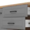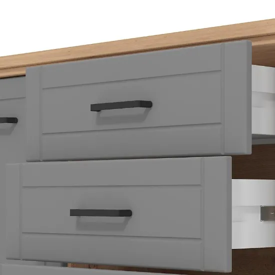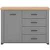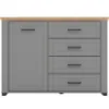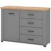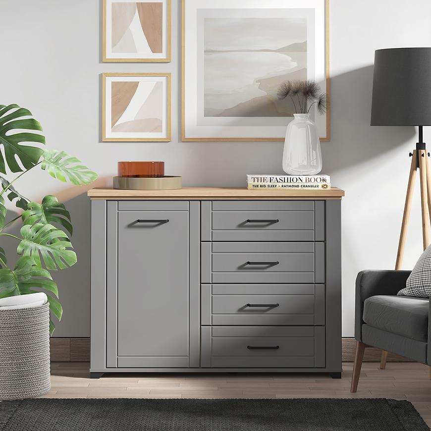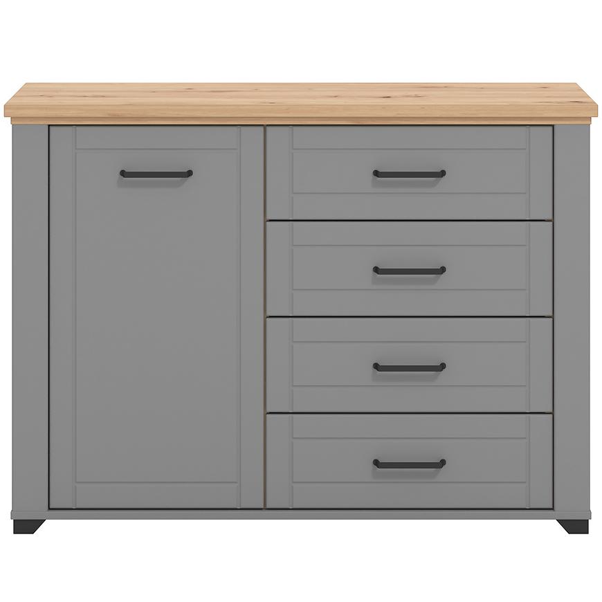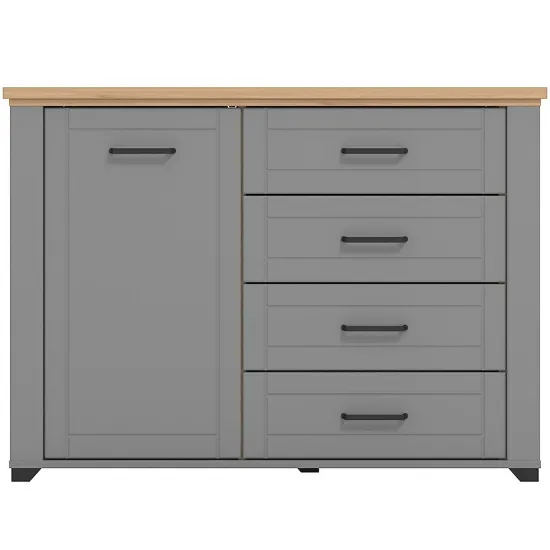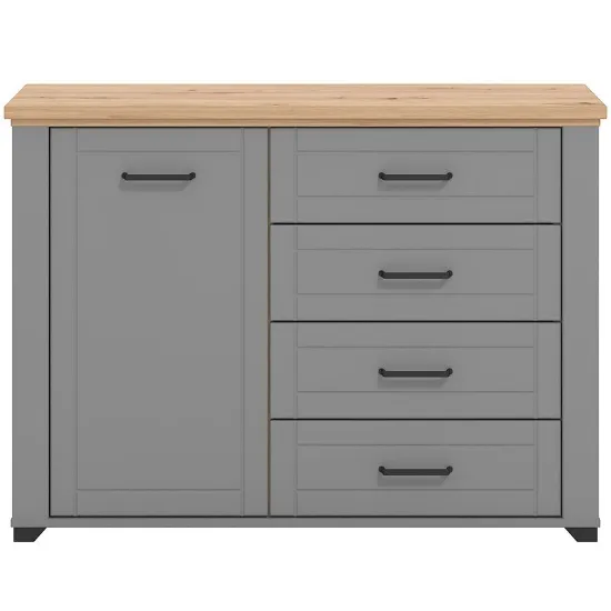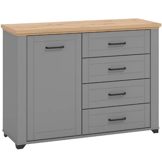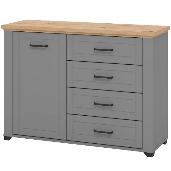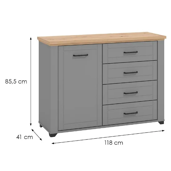 Komoda Valencia to elegancka i funkcjonalna część kolekcji o nowoczesnym stylu. Wykonana z wysokiej jakości płyty wiórowej laminowanej w kolorze artisan, zapewnia trwałość i estetyczny wygląd na lata. Jej minimalistyczny design obejmuje jednodrzwiowe fronty w szarym kolorze oraz cztery pojemne szuflady, które oferują wystarczająco miejsca na przechowywanie.