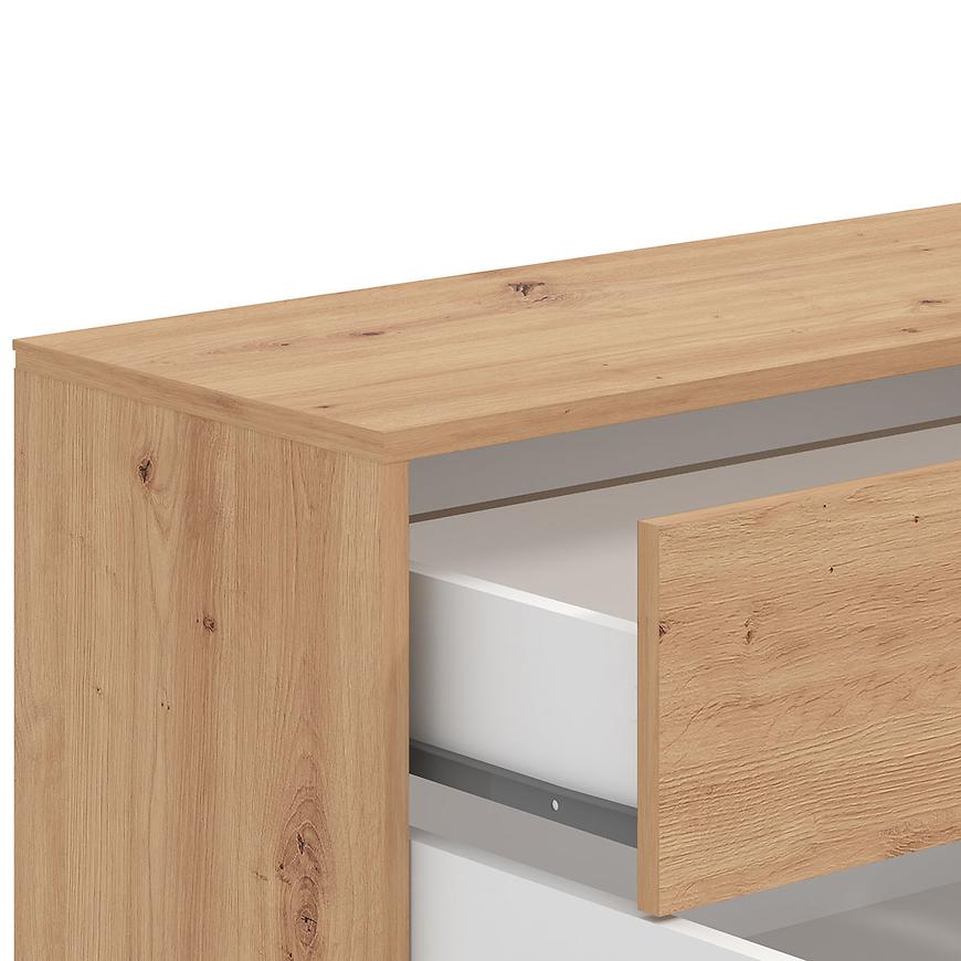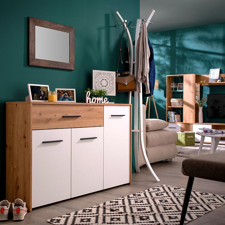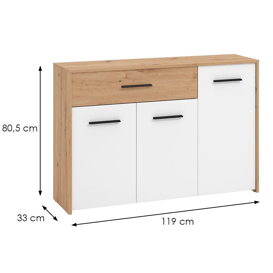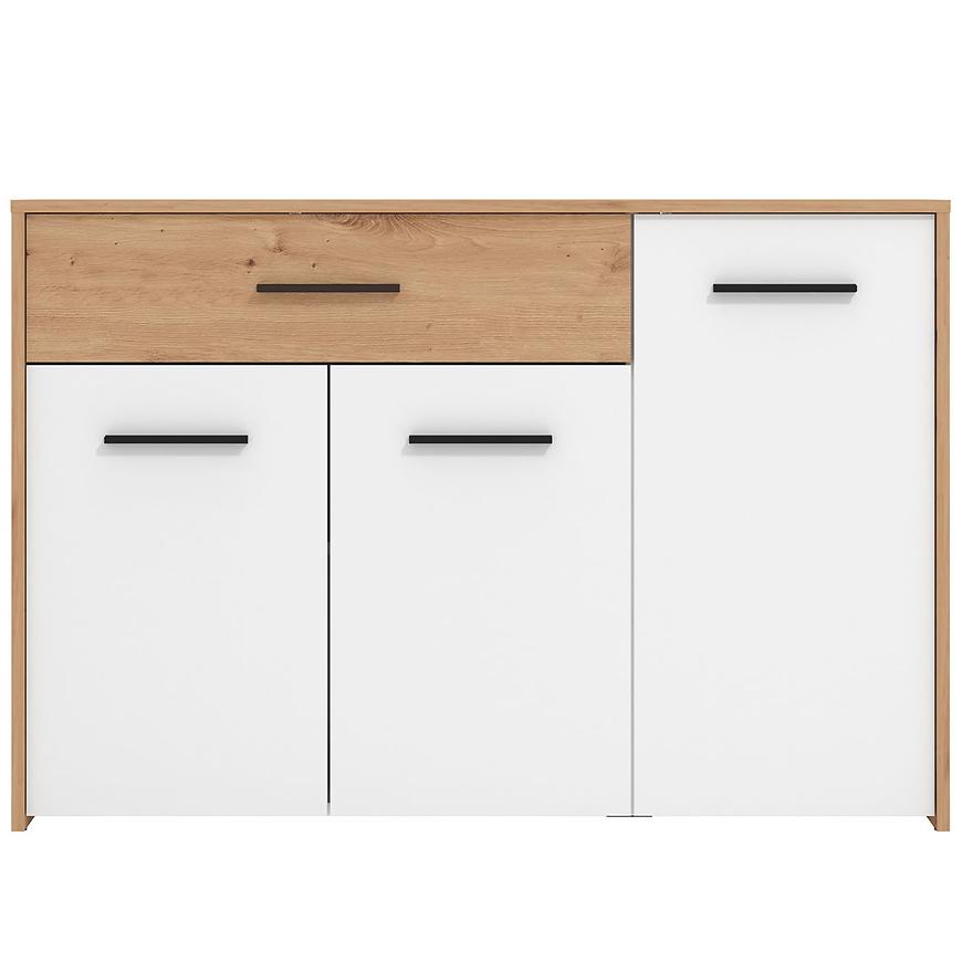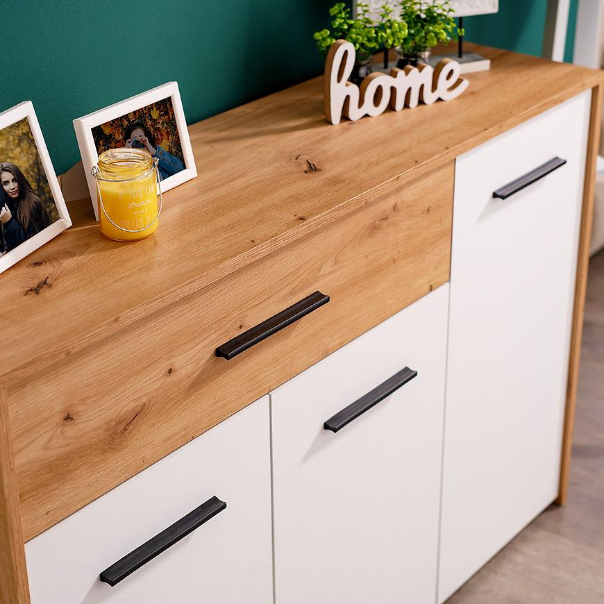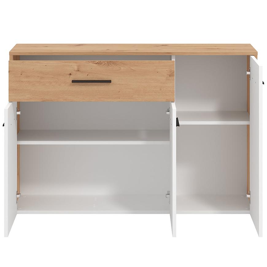 Komoda Varadero artisan/biały to wyjątkowy mebel, który doskonale wpisuje się w nowoczesne wnętrza, nadając im subtelną elegancję i funkcjonalność. Ta trzydrzwiowa komoda jest idealnym rozwiązaniem do przechowywania różnorodnych przedmiotów w jednym miejscu, zapewniając jednocześnie estetyczny wygląd. Fronty komody wykonane są z trwałej płyty wiórowej laminowanej, co gwarantuje ich wyjątkową wytrzymałość na uszkodzenia mechaniczne oraz wilgoć. Kolor frontów, który łączy w sobie świeży biały i ciepły dąb artisan, nadaje meblowi unikalny charakter i harmonijnie komponuje się z różnymi stylami aranżacji wnętrz.