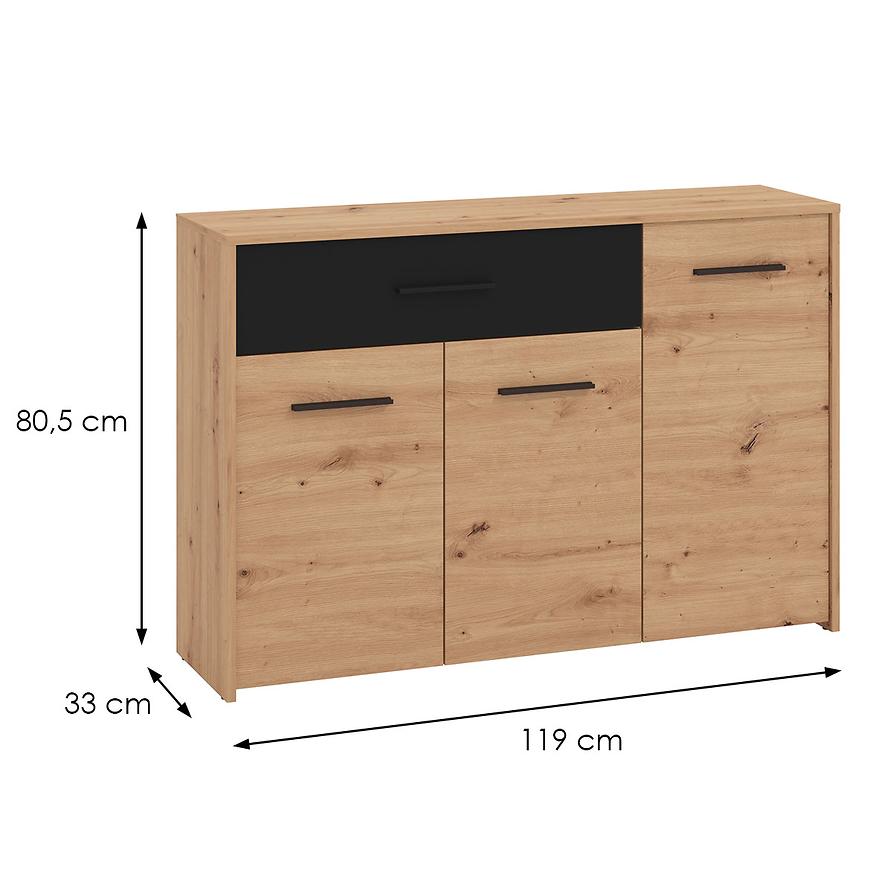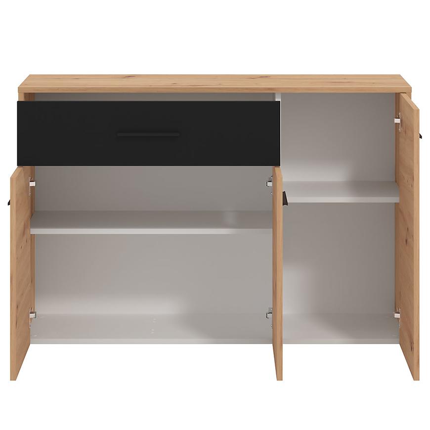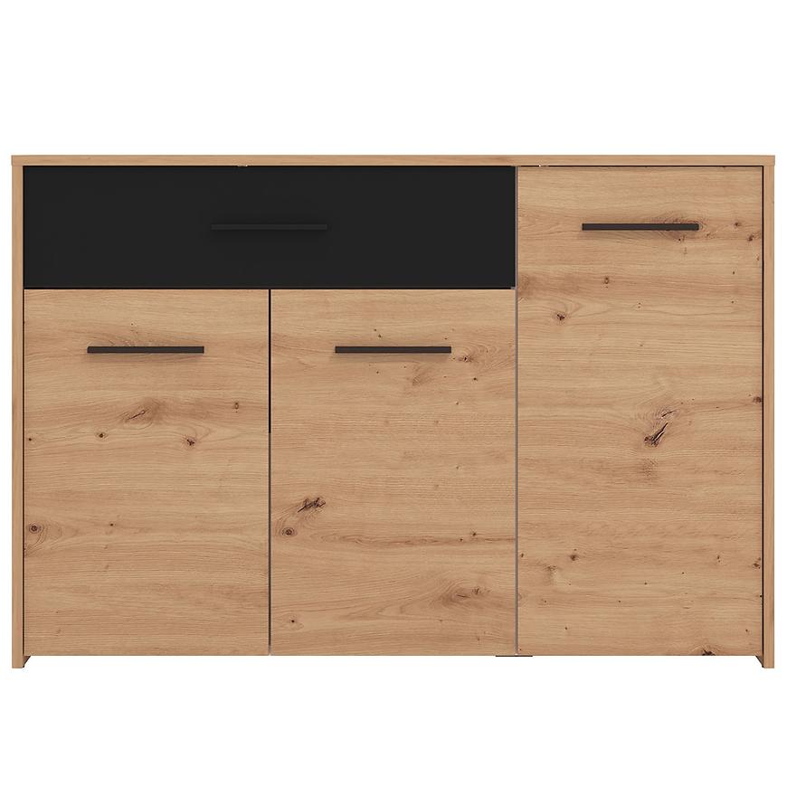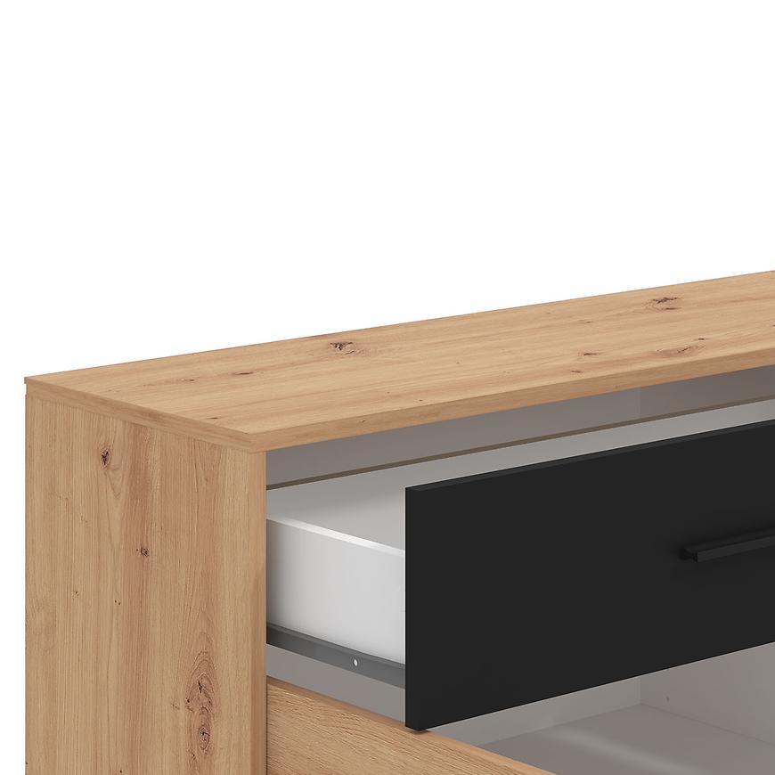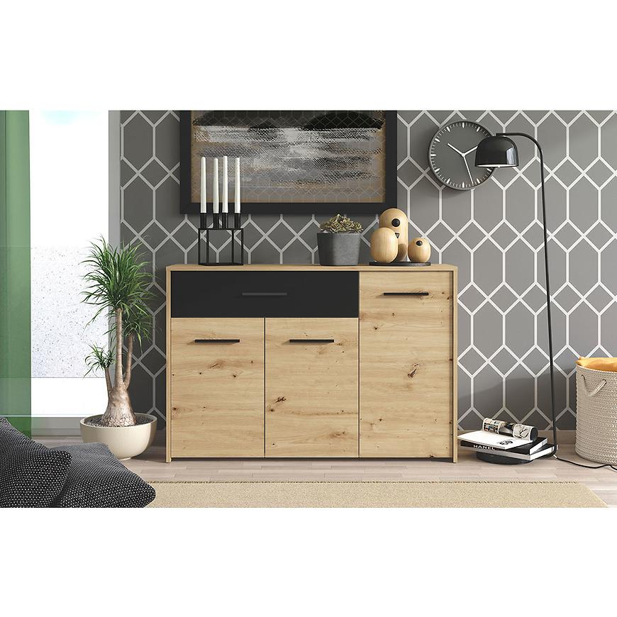 Komoda Varadero artisan/czarny to wyjątkowy mebel, który doskonale wpisuje się w nowoczesne wnętrza, nadając im subtelną elegancję i funkcjonalność. Ta komoda jest idealnym rozwiązaniem do przechowywania różnorodnych przedmiotów w jednym miejscu, zapewniając jednocześnie estetyczny wygląd. Fronty komody wykonane są z trwałej płyty wiórowej laminowanej, co gwarantuje ich wyjątkową wytrzymałość na uszkodzenia mechaniczne oraz wilgoć. Kolor frontów nadaje meblowi unikalny charakter i harmonijnie komponuje się z różnymi stylami aranżacji wnętrz.
