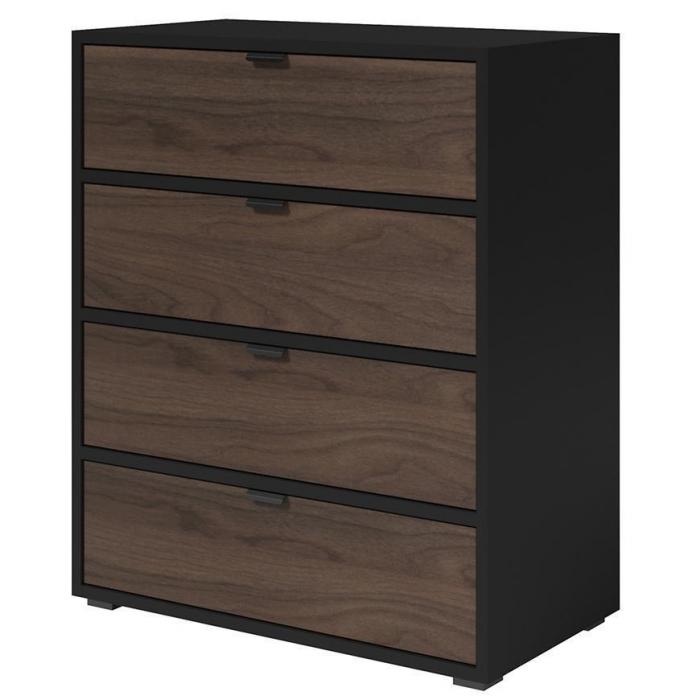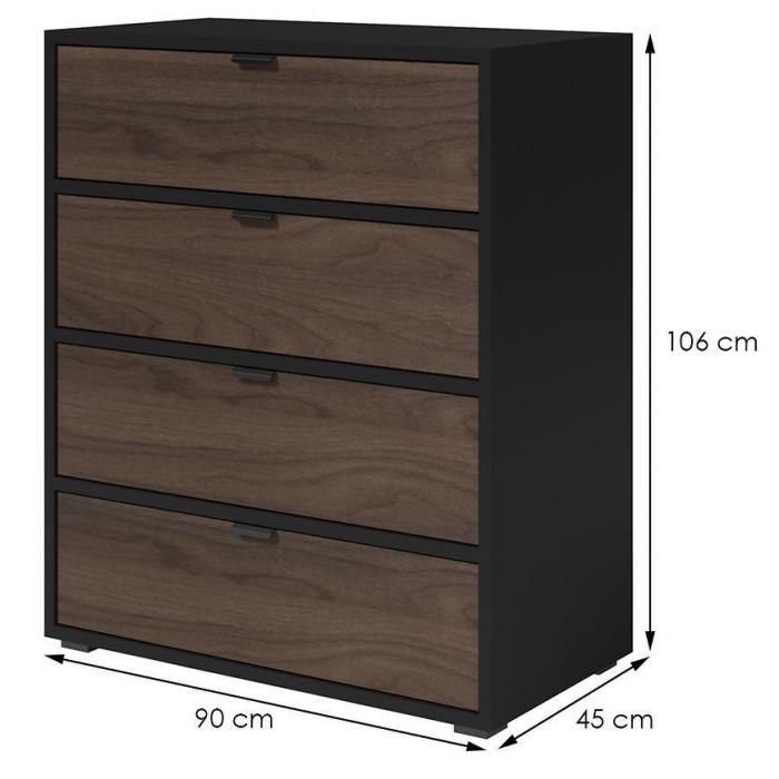 Doskonałym wyborem do pokoju dziennego, czy młodzieżowego będzie komoda w kolorze czarny/orzech, materiał wykonania to płyta laminowana. Komoda posiada cztery szuflady dzięki czemu ma łatwy dostęp do wnętrza. Komoda dopełni również wystrój salonu, czy przedpokoju, stanowiąc wygodne miejsce do przechowywania mniejszych i większych rzeczy. Mebel do samodzielnego montażu.