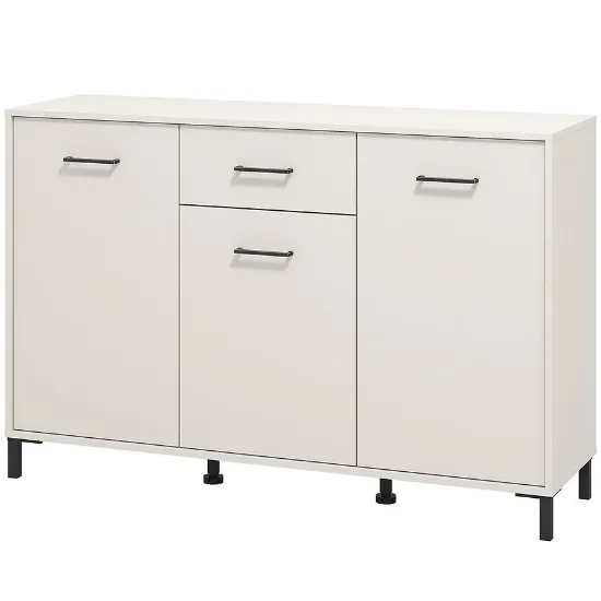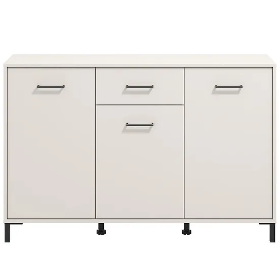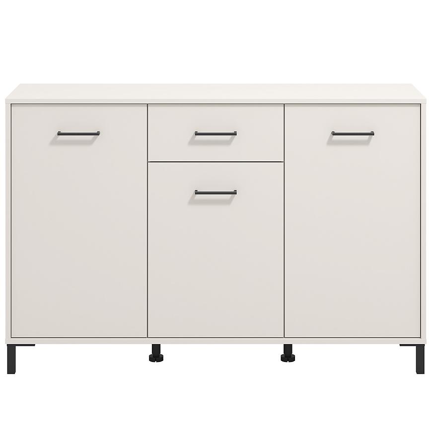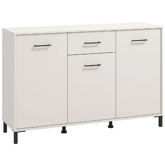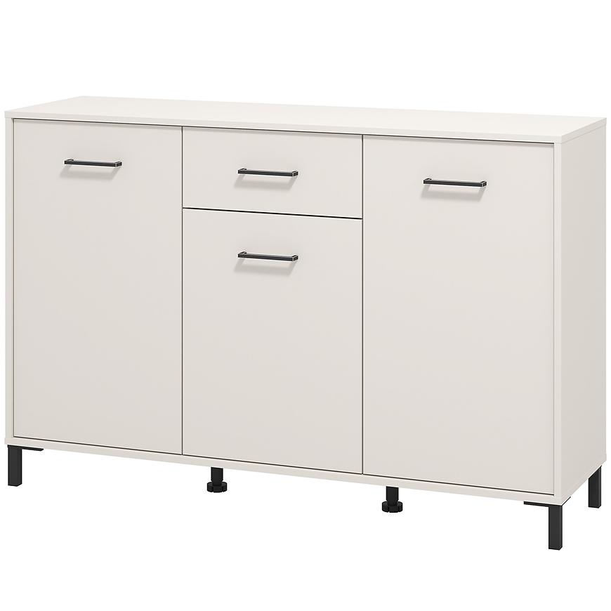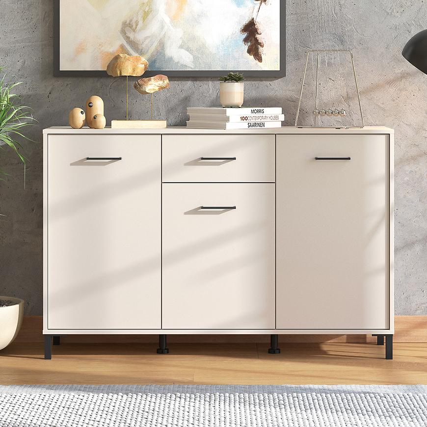 Komoda Vienne to doskonałe rozwiązanie dla osób ceniących elegancję i praktyczność. Wyposażona w trzy drzwi i szufladę, zapewnia wygodne przechowywanie odzieży, dokumentów lub akcesoriów, pomagając utrzymać porządek w każdym pomieszczeniu. Mebel utrzymany jest w modnym kolorze kaszmir z matowym wykończeniem, które dodaje całości nowoczesnego, subtelnego charakteru.