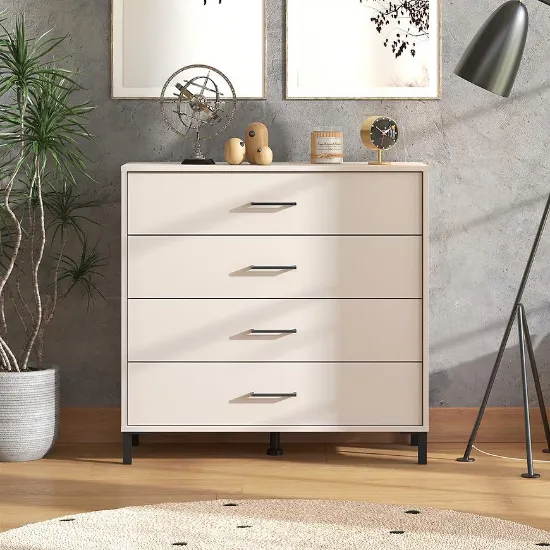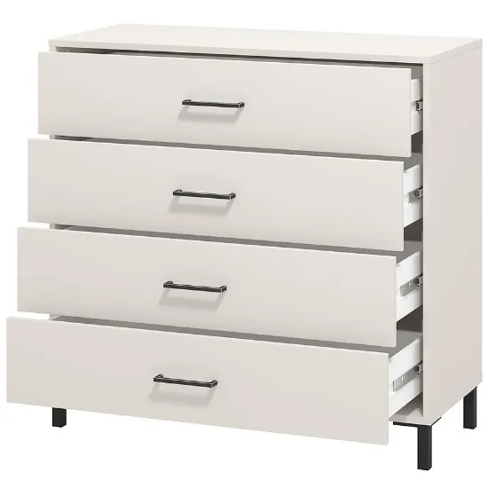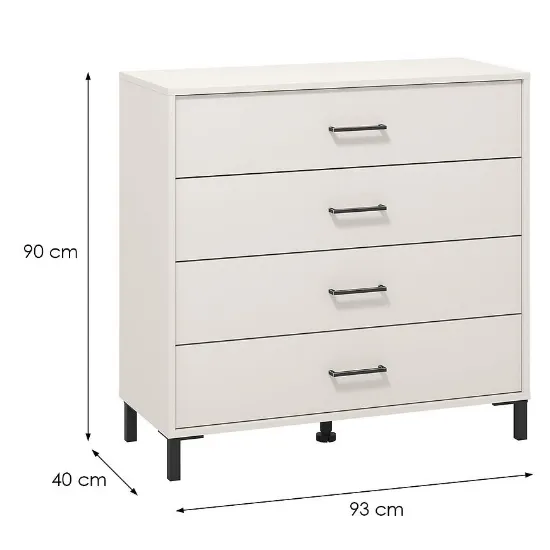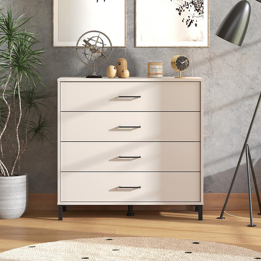 Komoda Vienne to doskonałe rozwiązanie dla osób ceniących elegancję i praktyczność. Wyposażona w cztery pojemne szuflady, zapewnia wygodne przechowywanie odzieży, dokumentów lub akcesoriów, pomagając utrzymać porządek w każdym pomieszczeniu. Mebel utrzymany jest w modnym kolorze kaszmir z matowym wykończeniem, które dodaje całości nowoczesnego, subtelnego charakteru.