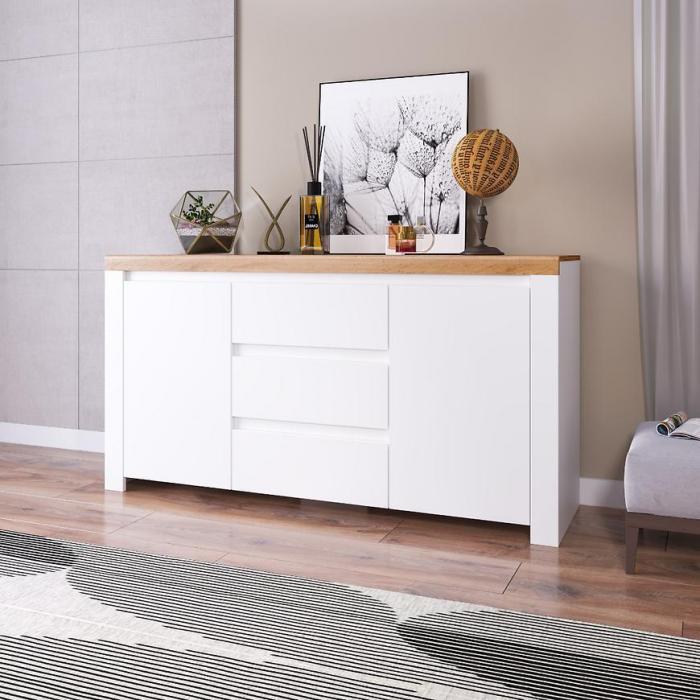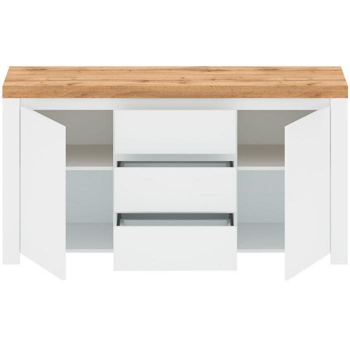 Doskonałym wyborem do pokoju dziennego będzie komoda w kolorze biały/dąb wotan z serii Vigo , materiał wykonania to płyta meblowa. Komoda posiada drzwiczki oraz szuflady, dzięki czemu ma łatwy dostęp do wnętrza. Komoda dopełni również wystrój salonu, czy przedpokoju, stanowiąc wygodne miejsce do przechowywania mniejszych i większych rzeczy. Mebel do samodzielnego montażu.