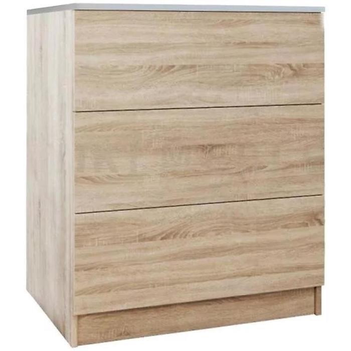 Komoda Vista w kolorze dąb sonoma to przede wszystkim nowoczesność i funkcjonalność w jednym. Mebel doskonale sprawdzi się w każdym pomieszczeniu. Materiał wykonania to płyta wiórowa laminowana. Komoda posiada trzy szuflady dzięki czemu ma łatwy dostęp do wnętrza. Wygląd mebli jest nowoczesny, a zarazem uniwersalny. Mebel będzie pasował do wielu pomieszczeń jak np. jadalni czy pokoju dziennego. Meble jest bardzo pojemny, dlatego sprawdzi się w każdym pomieszczeniu - zarówno w sypialni, pokoju dziennym, młodzieżowym, czy też salonie. Mebel do samodzielnego montażu.
