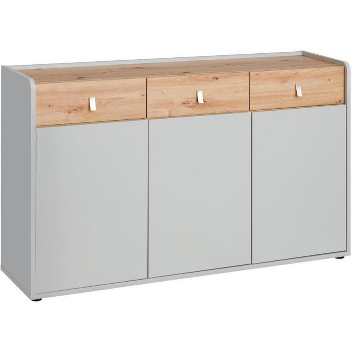 Doskonałym wyborem do pokoju dziennego będzie komoda w kolorze perła gray/artisan z serii Vivero, materiał wykonania to płyta laminowana. Komoda posiada drzwiczki oraz szuflady, dzięki czemu ma łatwy dostęp do wnętrza. Komoda dopełni również wystrój salonu, czy przedpokoju, stanowiąc wygodne miejsce do przechowywania mniejszych i większych rzeczy. Mebel do samodzielnego montażu.