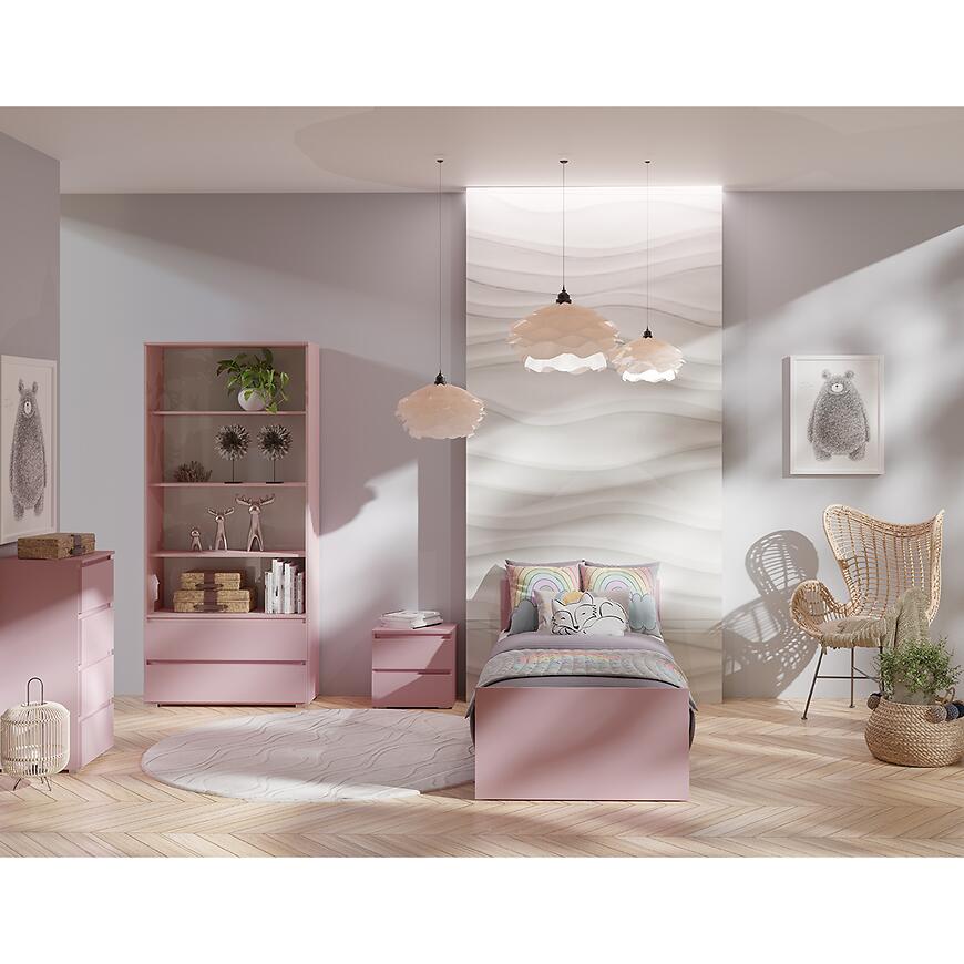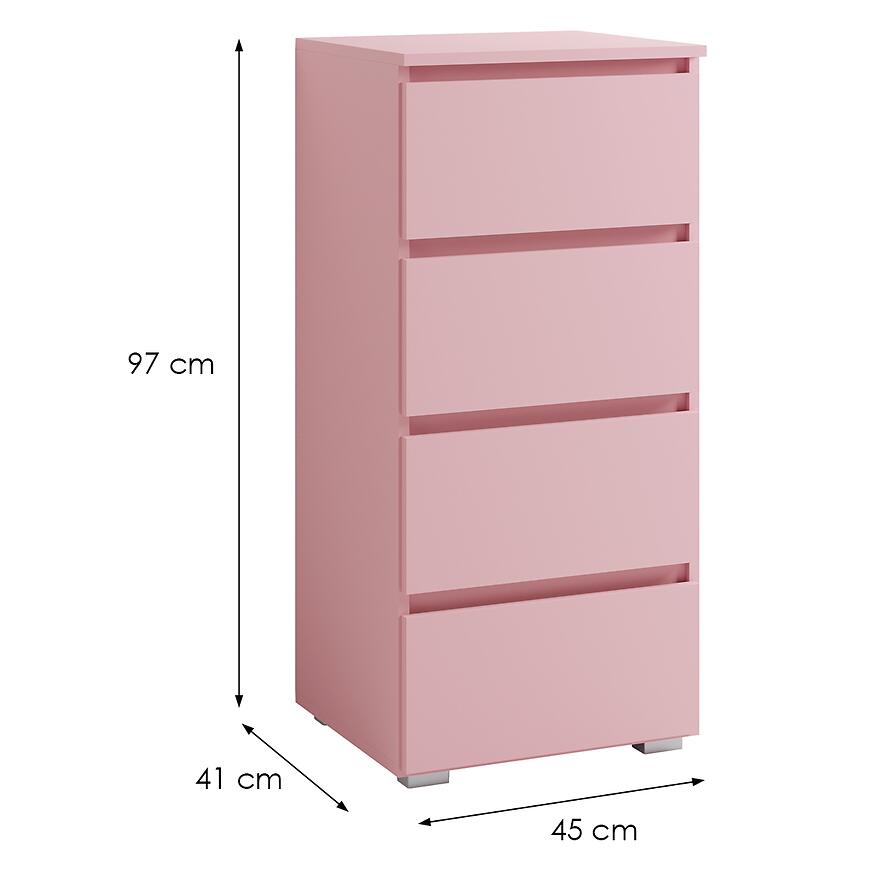 Komoda Wąska 4s Cosmo C07 Różowy to funkcjonalny i stylowy mebel o wymiarach 45 cm szerokości, 97 cm wysokości i 41 cm głębokości. Wykonana z trwałej płyty wiórowej laminowanej w kolorze różowym, z matowym wykończeniem frontów i korpusu, łączy nowoczesny design z praktycznym zastosowaniem. Posiada 4 pojemne szuflady, idealne do przechowywania różnorodnych przedmiotów. Należy do kolekcji COSMO, waży 27 kg i wymaga samodzielnego montażu.
