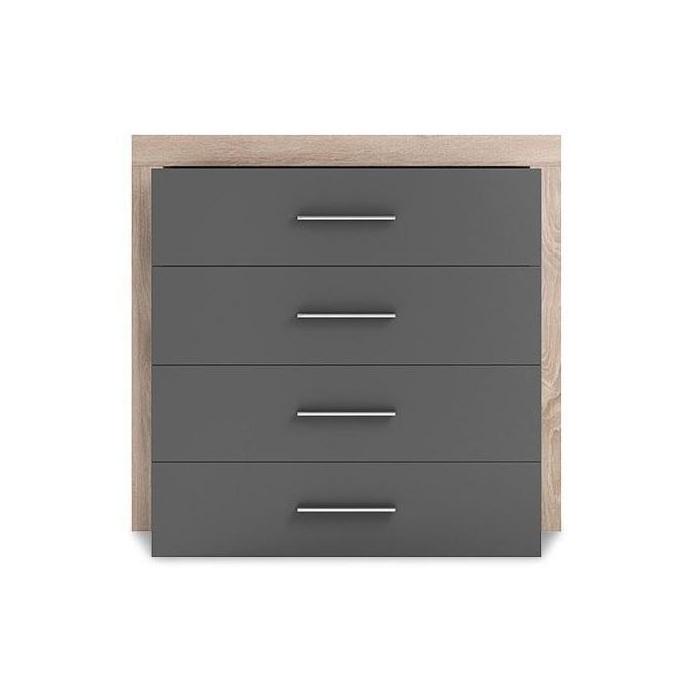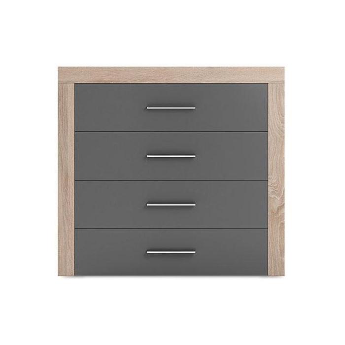 Komoda Titto z czteroma szufladami to połączenie nowoczesnego stylu z eleganckim wykończeniem. Mebel wpisuje się w charakter aktualnych trendów i na pewno sprawdzi się we wnętrzach utrzymanych w estetyce klasycznej i modernistycznej. Komoda Titto będzie stanowić funkcjonalny element wyposażenia sypialni, garderoby oraz salonu. Połączenie kolorystyki dębu z antracytem wpływa na nietypowy charakter mebla. Użytkowników zachwyca także wysoka jakość, na którą składa się solidna płyta laminowana oraz metalowe uchwyty. Szerokie możliwości aranżacyjne sprawiają, że komoda będzie jednym z Twoich ulubionych mebli. Mebel do samodzielnego montażu. Wymiary paczek: 1/2. 99,5x44,5x16; 2/2. 90x24x7