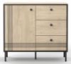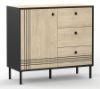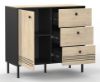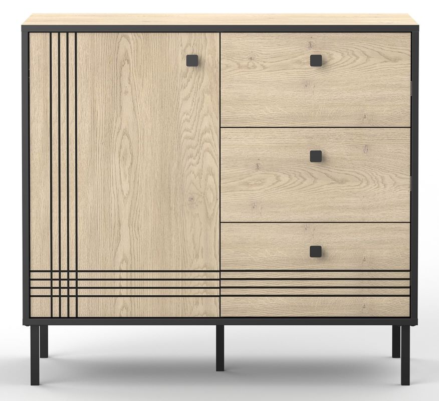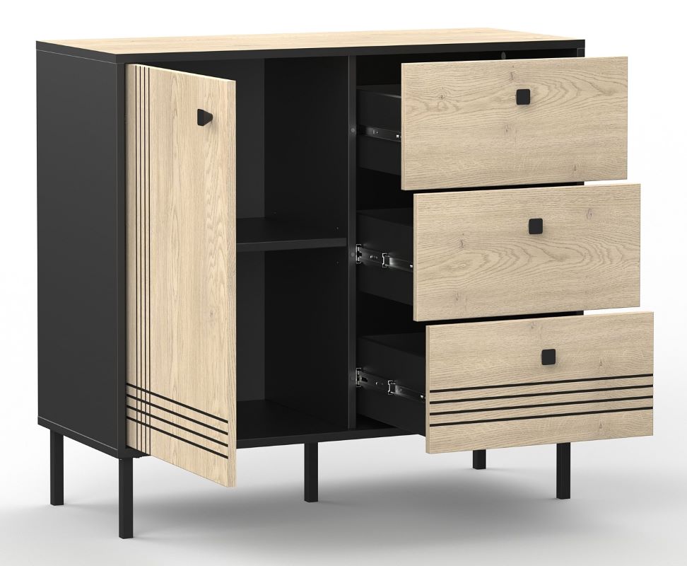 Korpus w głębokiej czerni doskonale kontrastuje z dekorem cremona, który swoim ciepłym, drewnianym odcieniem dodaje wnętrzu przytulności. Subtelne frezy podkreślają unikalny charakter mebla, a stalowe czarne nóżki zapewniają stabilność i nadają całości nowoczesnego wyglądu.