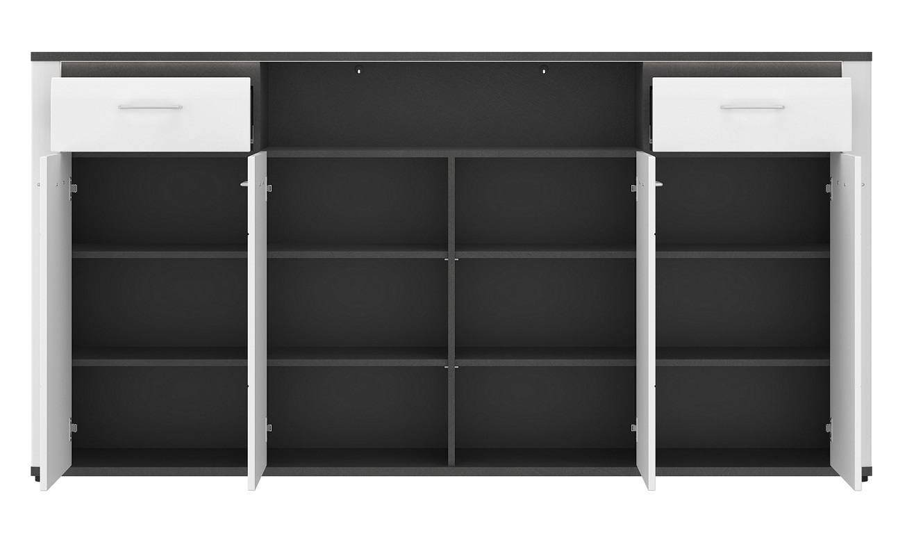 Komoda Alassio ALSK06 to elegancka, czterodrzwiowa propozycja, idealna do przechowywania w pokoju dziennym, która dzięki swojej funkcjonalności sprawdzi się także w innych pomieszczeniach. Zawiera cztery przestronne drzwiczki oraz dwie praktyczne szuflady, które pomieszczą zarówno mniejsze, jak i większe przedmioty. Wygodne metalowe uchwyty w kolorze natural/chrom dodają komodzie nowoczesnego charakteru i ułatwiają codzienne korzystanie.