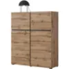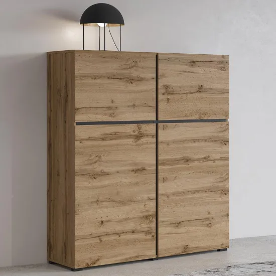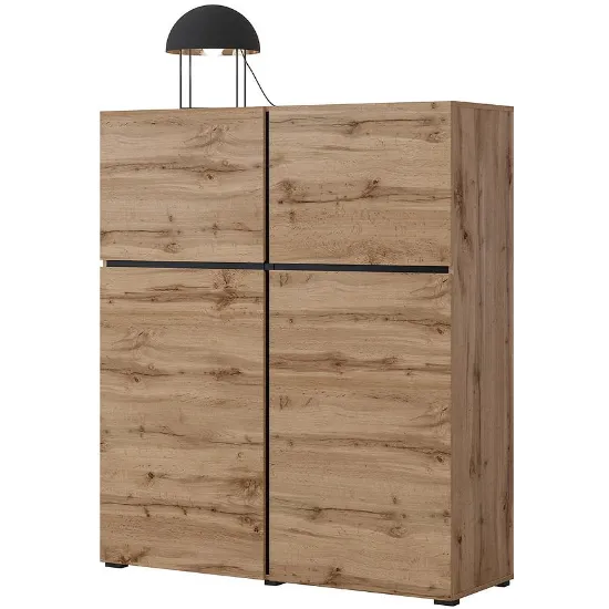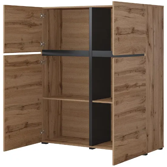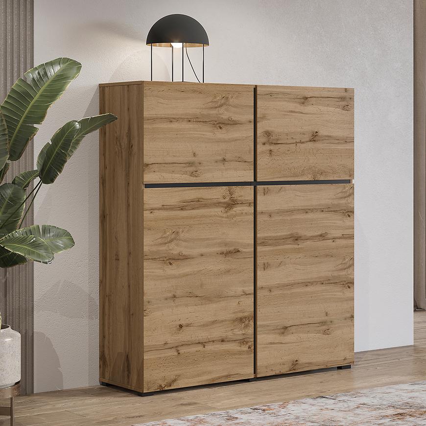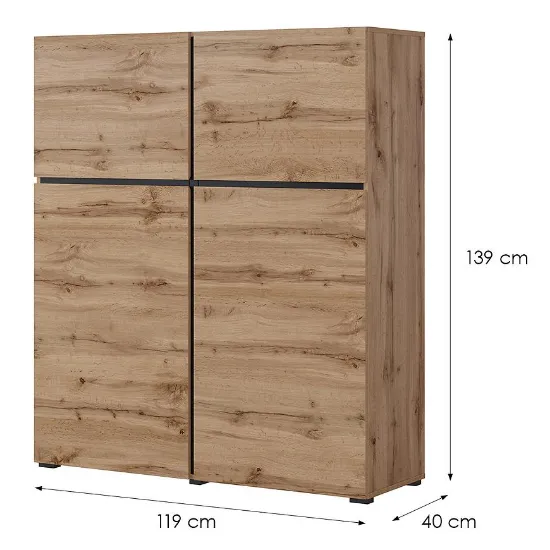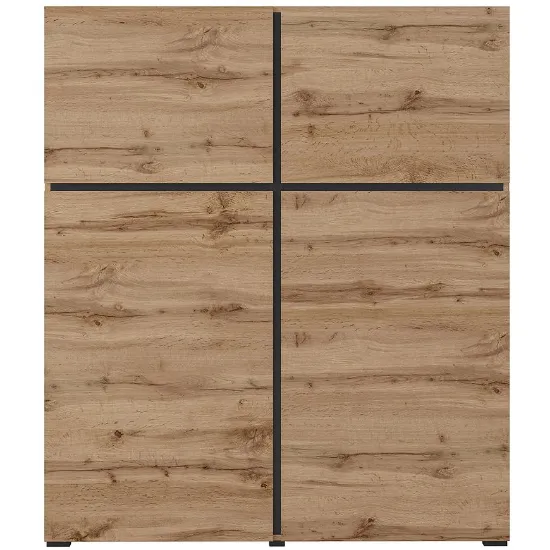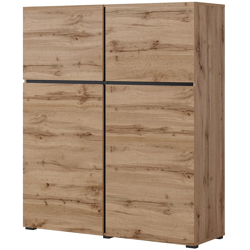 Komoda Wysoka Cross 4D w kolorze dąb wotan i czarnym to elegancki i przestronny mebel, który wprowadza do wnętrza nowoczesny i jednocześnie przytulny charakter. Jasne, drewnopodobne wybarwienie frontów w odcieniu dębu wotan efektownie kontrastuje z matowymi czarnymi akcentami, tworząc niepowtarzalny styl, który idealnie wpisuje się w współczesne trendy aranżacyjne. Ten estetyczny duet kolorów sprawia, że komoda świetnie prezentuje się zarówno w przestrzeniach minimalistycznych, jak i tych o bardziej loftowym klimacie.