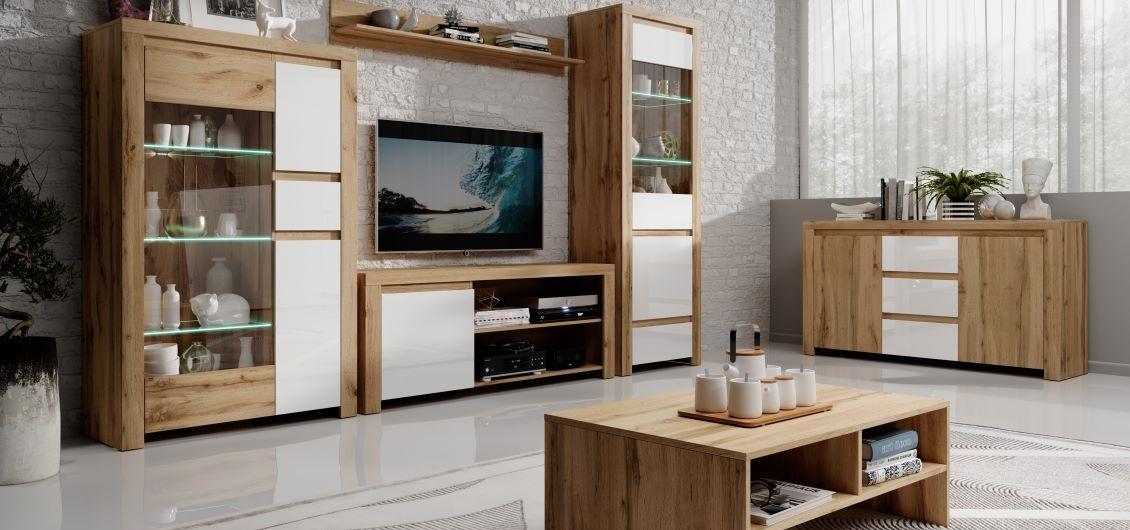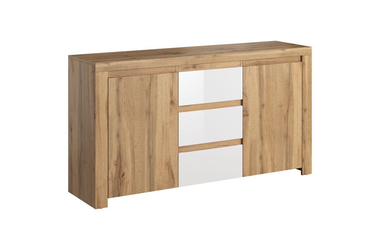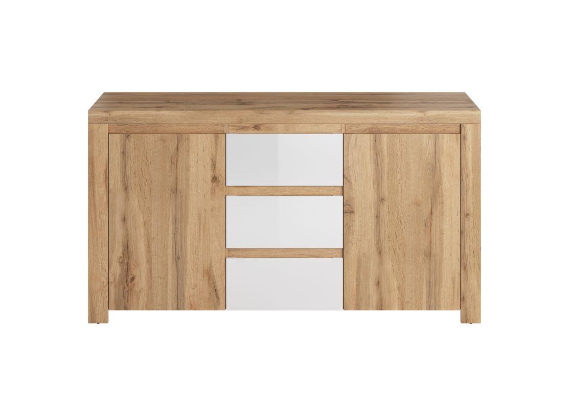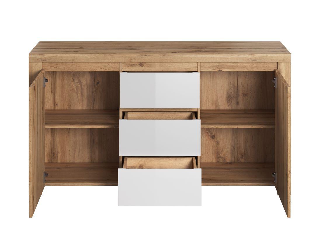 Komoda Xavi to praktyczny mebel do pokoju dziennego, salonu lub sypialni. Kolor dąb wotan/biały wpasuje się w wiele aranżacji w nowoczesnych wnętrzach jak również we wnętrzach klasycznych. Szafka wyposażona została w szuflady i drzwiczki dzięki czemu ma łatwy dostęp do wnętrza oraz odpowiednią przestrzeń do przechowywania. Płyta laminowana to płyta z której wykonano komodę. Do kompletu można dokupić inne meble z kolekcji.