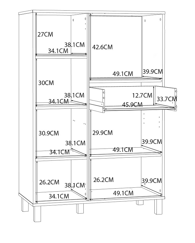 Nóżki komody, wykonane z płyty MDF w kolorze czarnym, dodają lekkości konstrukcji, jednocześnie zapewniając stabilność. Komoda lekko unosząca się nad podłogą prezentuje się stylowo i nowocześnie.